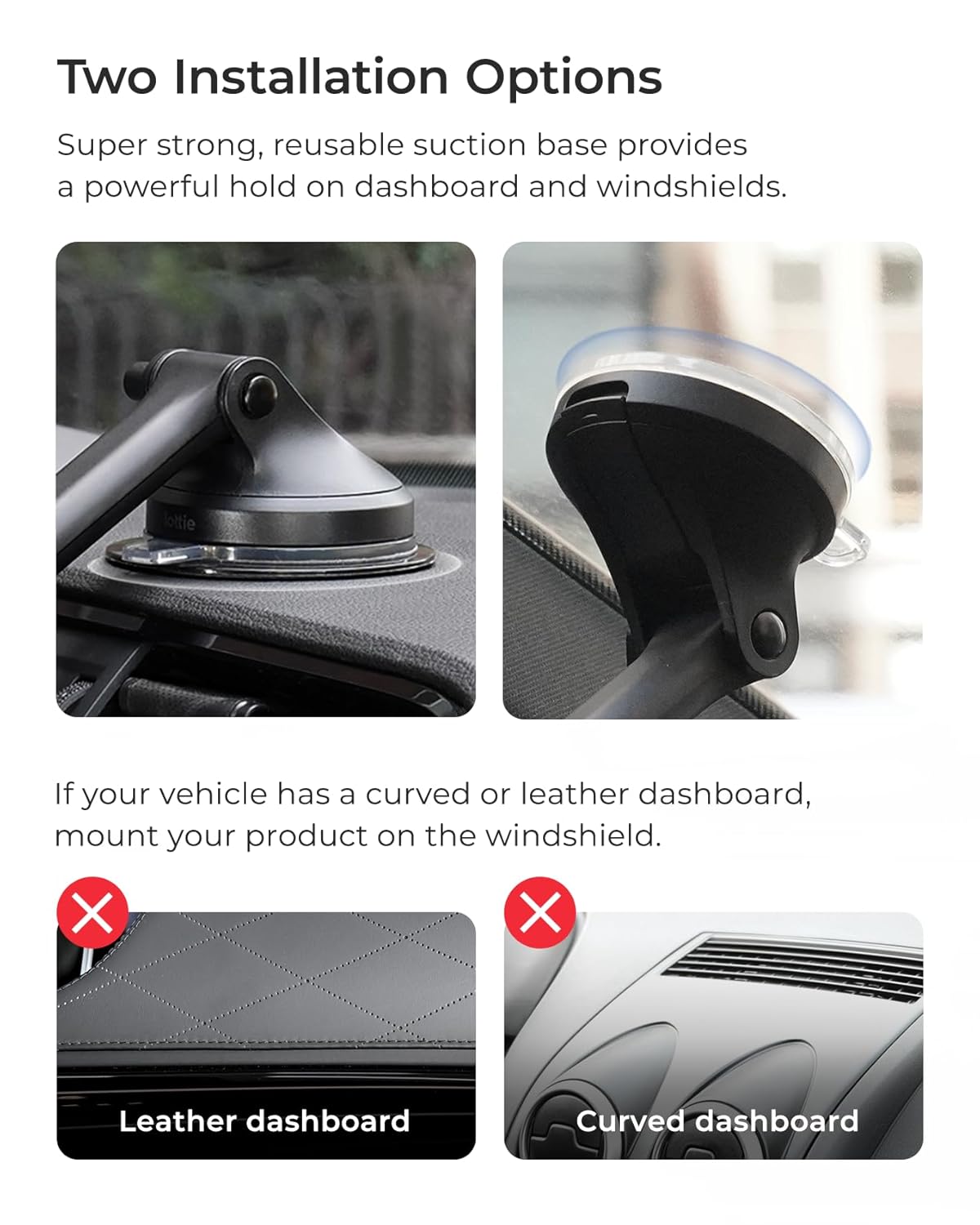 A instalação do iOttie Velox Qi2 Mini é simples e prática. Seu suporte de ventosa super forte, com fórmula de gel adesivo, adere firmemente a painéis e para-brisas. Um pad para painel está incluído, assegurando uma fixação segura em superfícies texturizadas.