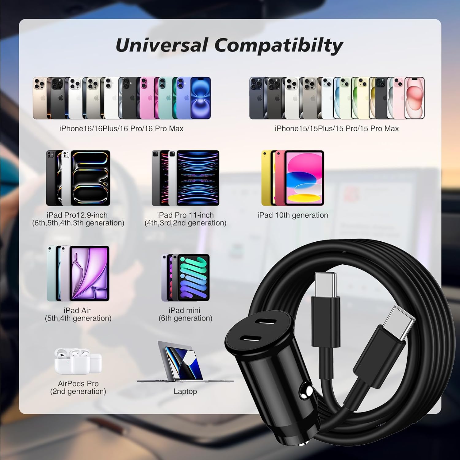 • O que você recebe: O pacote inclui um carregador rápido para carro e dois cabos USB-C para C de 3 pés, todos certificados pela Apple MFI. Oferecemos suporte ao cliente 24 horas para garantir uma experiência de compra agradável. Se você tiver qualquer problema durante o uso, pode entrar em contato conosco a qualquer momento para que possamos garantir sua satisfação!