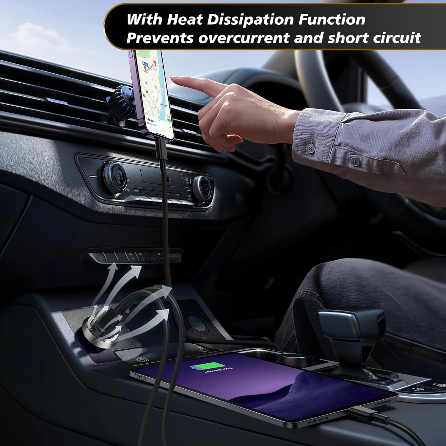 • Dissipação de Calor Segura: O carregador veicular de duas portas possui um sistema inteligente de controle de temperatura que oferece proteção contra sobrecarga, sobretensão, superaquecimento e curto-circuito. Ele detecta automaticamente e fornece a saída de carga ideal, permitindo que o iPhone funcione na velocidade esperada e garantindo um carregamento seguro.