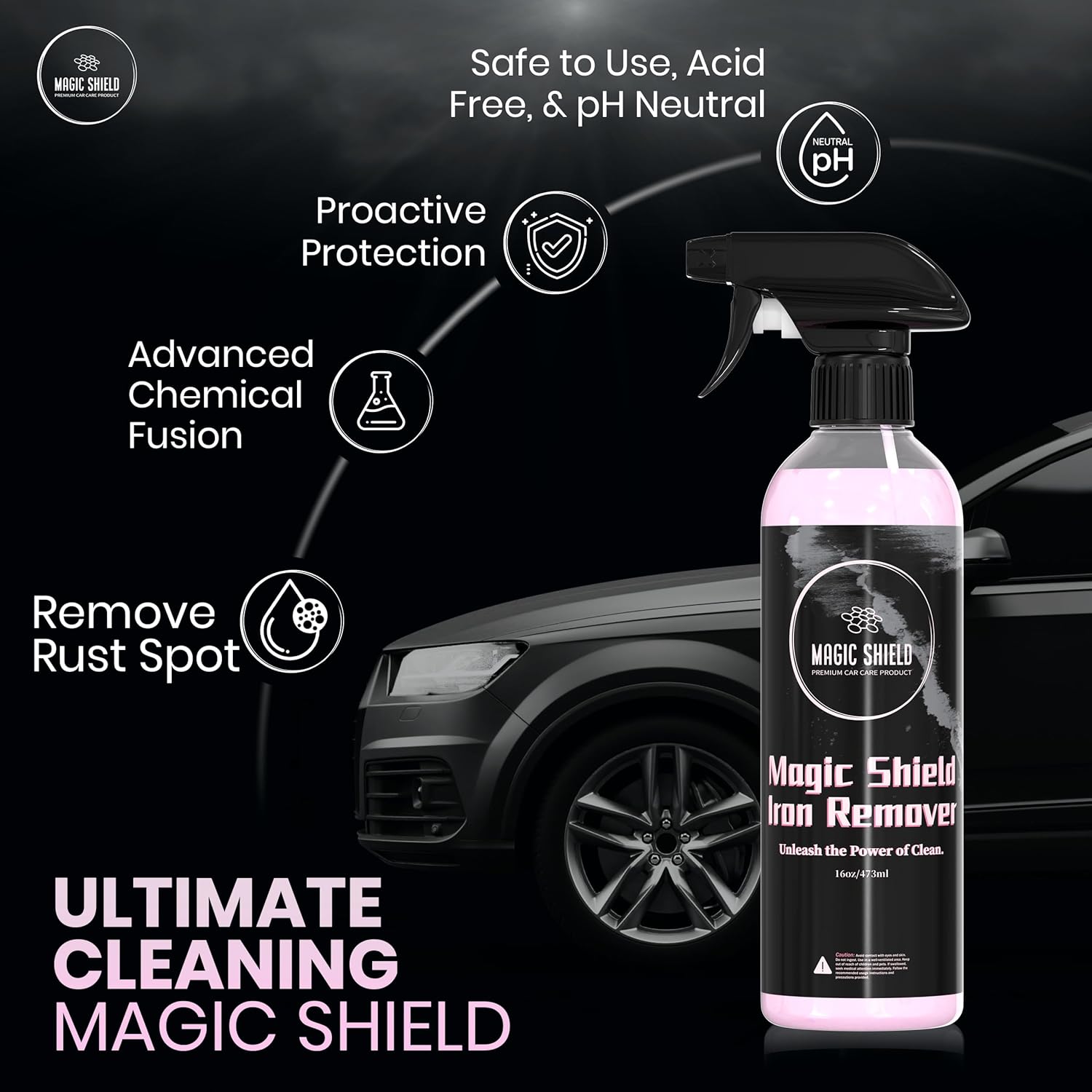 🌟 Remoção de Ferro e Contaminações: O Magic Shield car iron remover é projetado para atacar partículas de ferro, poeira de freio e outros resíduos que se acumulam nas superfícies do carro, proporcionando uma limpeza profunda e um acabamento liso e polido.