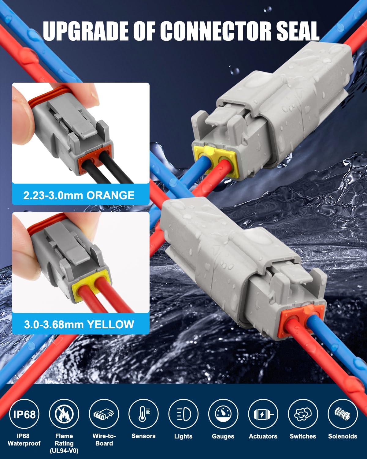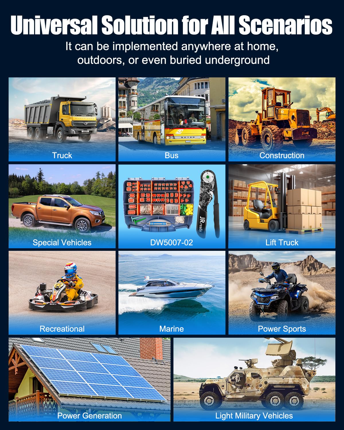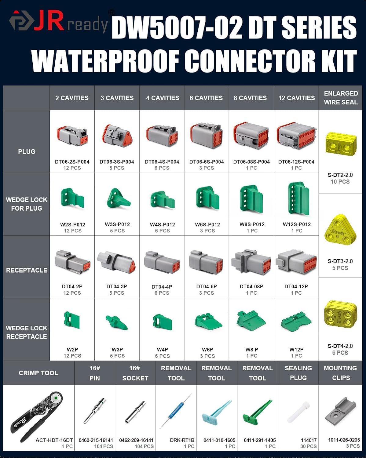 Kit de Conectores Deutsch JRready DW5007-02 - Conectores Elétricos Impermeáveis IP68 de 2, 3, 4, 6, 8 e 12 Pinos com Contatos Sólidos para Automóveis e Ferramenta de Crimpagem