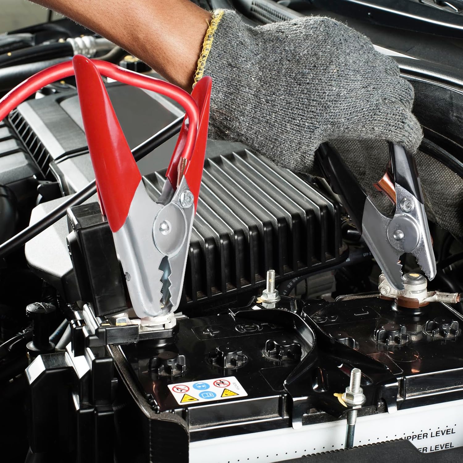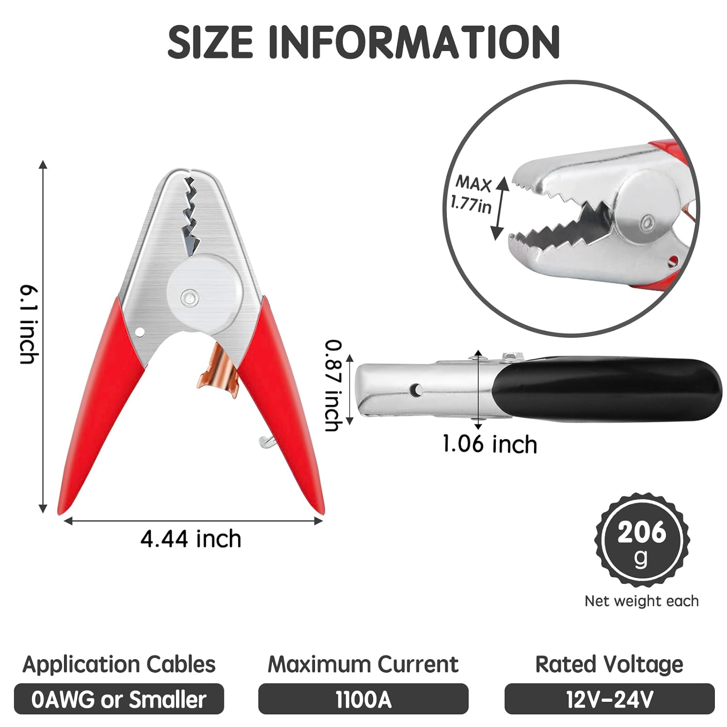 Os mandíbulas dentadas dos clamps são projetadas para oferecer uma força de aperto superior, assegurando que eles permaneçam firmemente fixados nos terminais da bateria, mesmo sob condições adversas. Com um peso de 206 g e dimensões de 6.1*4.44*1.06 polegadas, esses clamps são compatíveis com cabos de até 0 AWG, suportando uma corrente máxima de 1100A e recomendados para voltagens de 12V e 24V. A abertura máxima de 1.77 polegadas permite uma ampla gama de aplicações.