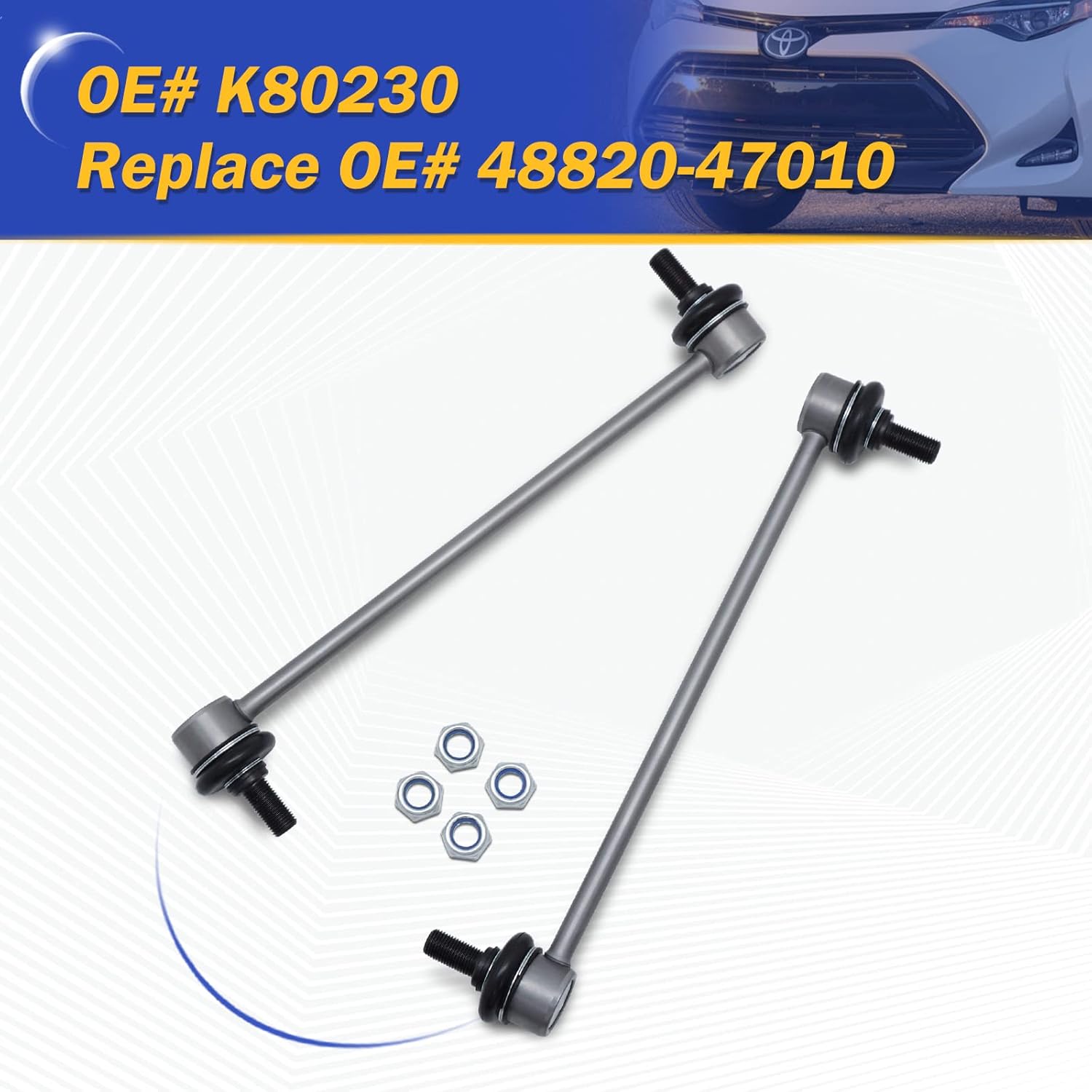 Os links de barra estabilizadora K80230 em liga de zinco-níquel são a solução ideal para quem busca qualidade e durabilidade na suspensão de veículos como o Pontiac Vibe (2003-2010), Scion Tc (2005-2010), Toyota Corolla (2003-2018), Toyota Matrix (2003-2014) e Toyota Prius (2001-2009). Com a referência OE# K80230, este produto é projetado para substituir a peça original OE# 48820-47010, garantindo uma instalação fácil e eficiente. Os planos de chave garantem uma instalação e remoção descomplicadas, e é recomendado o uso de uma chave Allen para segurar o meio enquanto se aperta o parafuso.