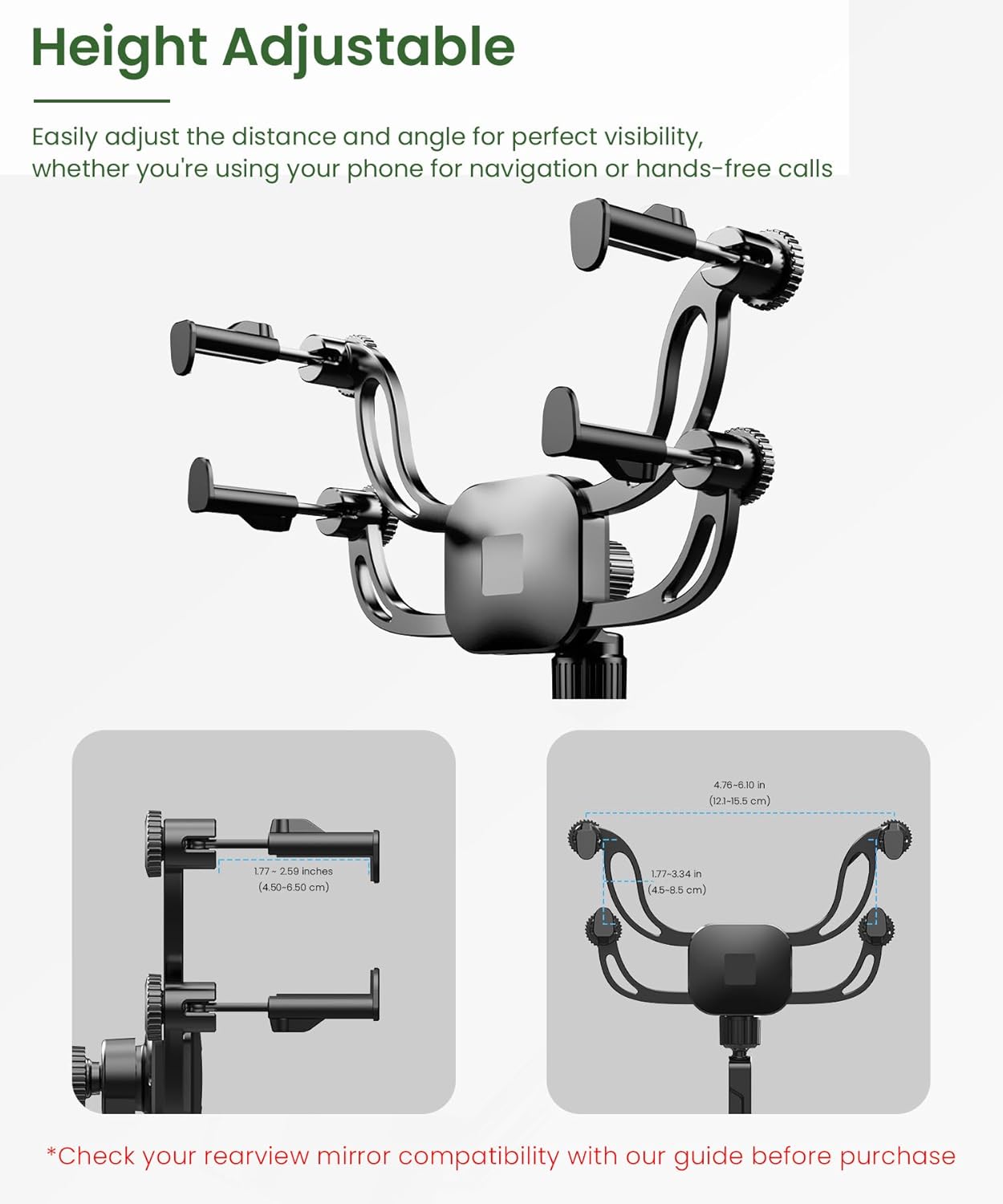 Universal Phone Compatibility, Adjustable Arm Length, Clear Windshield View, No Suction or Adhesive Needed, All-Metal Construction