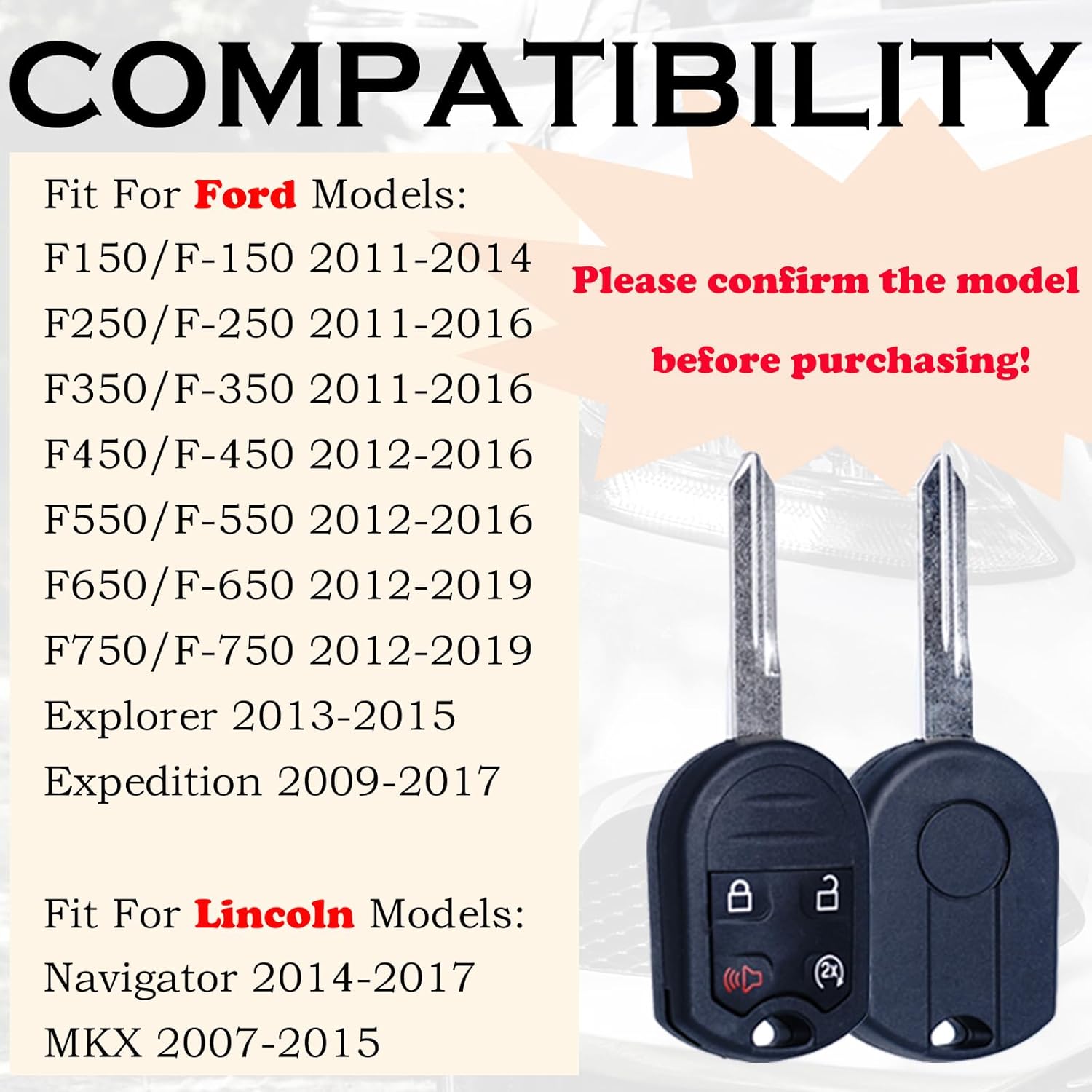 - COMPATIBILIDADE: Compatível com os IDs FCC CWTWB1U793 / OUC6000022. Verifique nossa descrição do produto e a ferramenta de compatibilidade de veículos para uma lista completa de veículos compatíveis. Este controle remoto é ideal para Ford F150/F-150 (2011-2014), F250, F350 (2011-2016), F450, F550, Explorer (2013-2015), Expedition (2009-2017), Lincoln Navigator (2014-2017) e MKX (2007-2015).