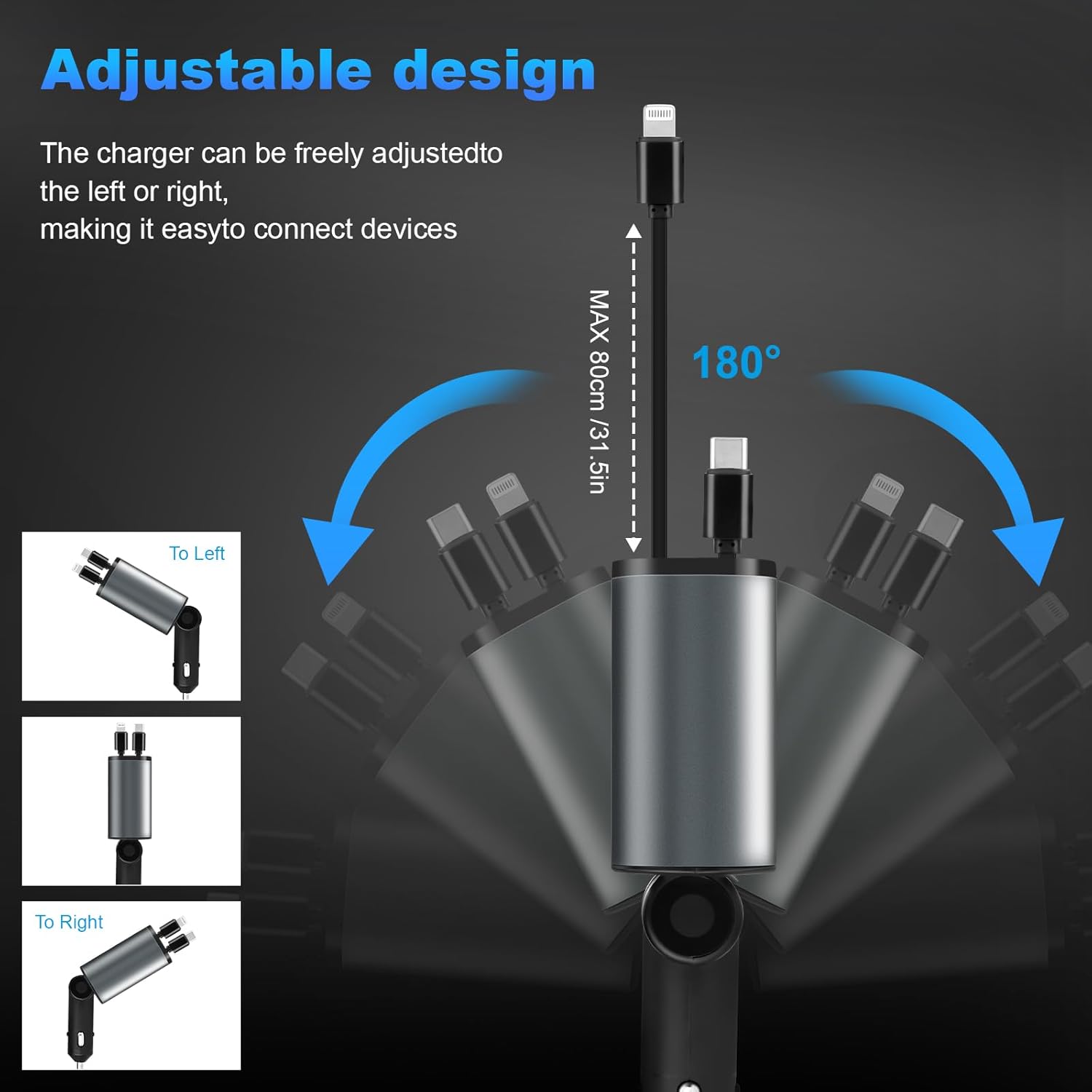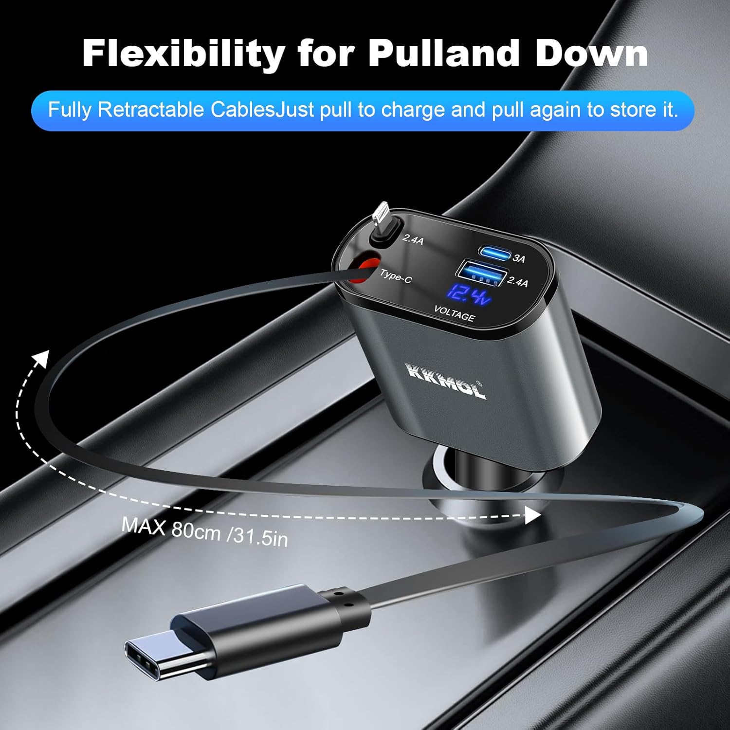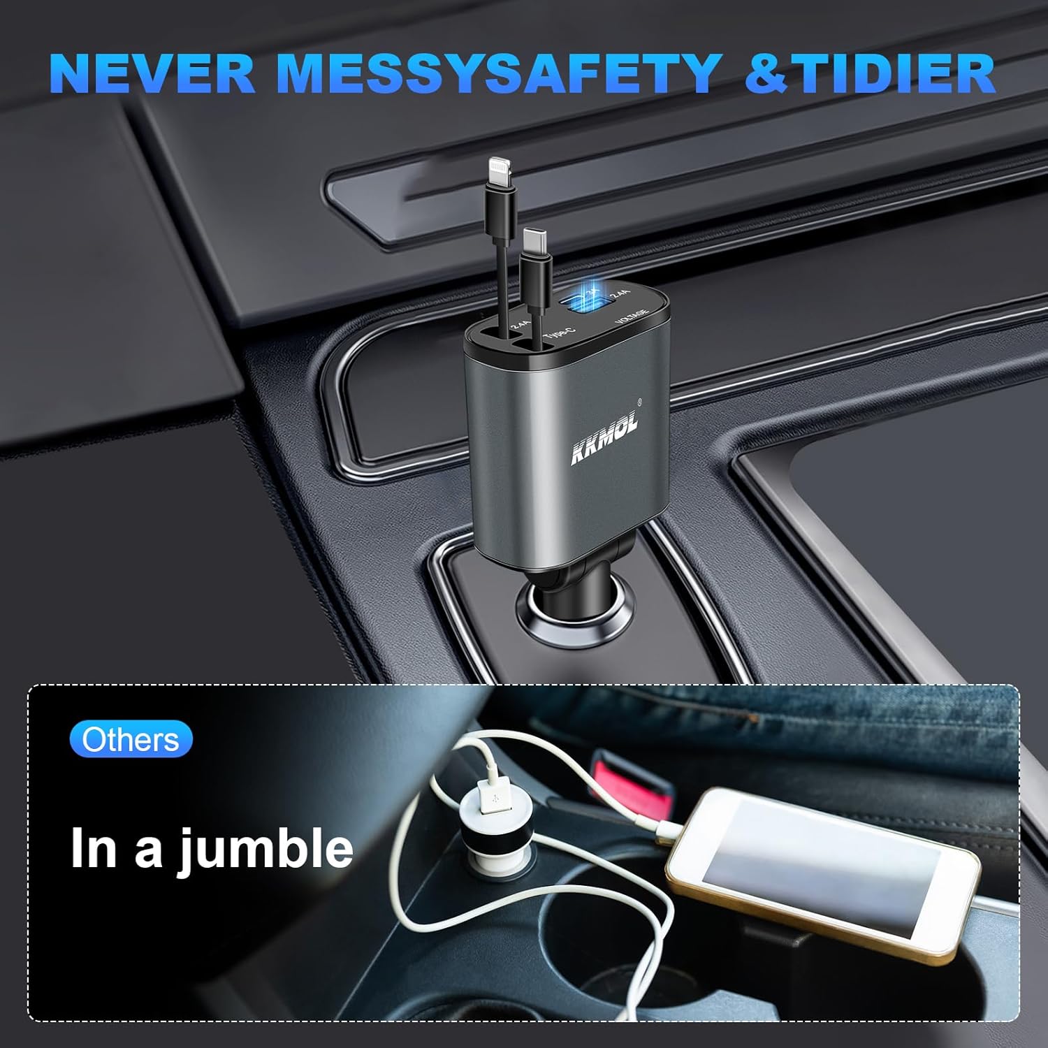 O KKMOL Retractable Car Charger é a solução definitiva para quem busca eficiência e praticidade no carregamento de dispositivos móveis enquanto está em movimento. Com uma potência impressionante de 100W, este carregador é capaz de fornecer energia rápida e segura para diversos dispositivos, incluindo smartphones, tablets e laptops. O design retrátil não só economiza espaço, mas também garante que os cabos estejam sempre organizados e prontos para uso.