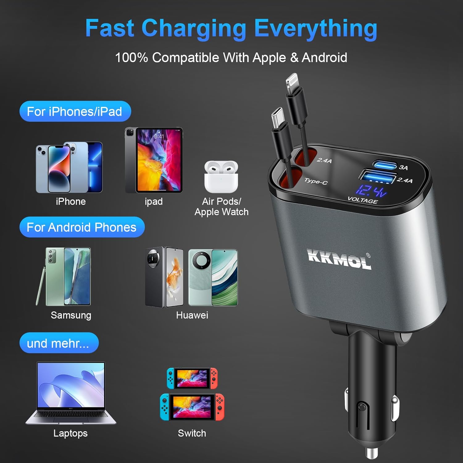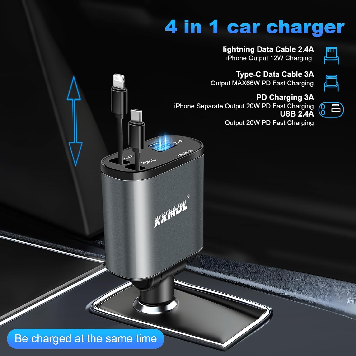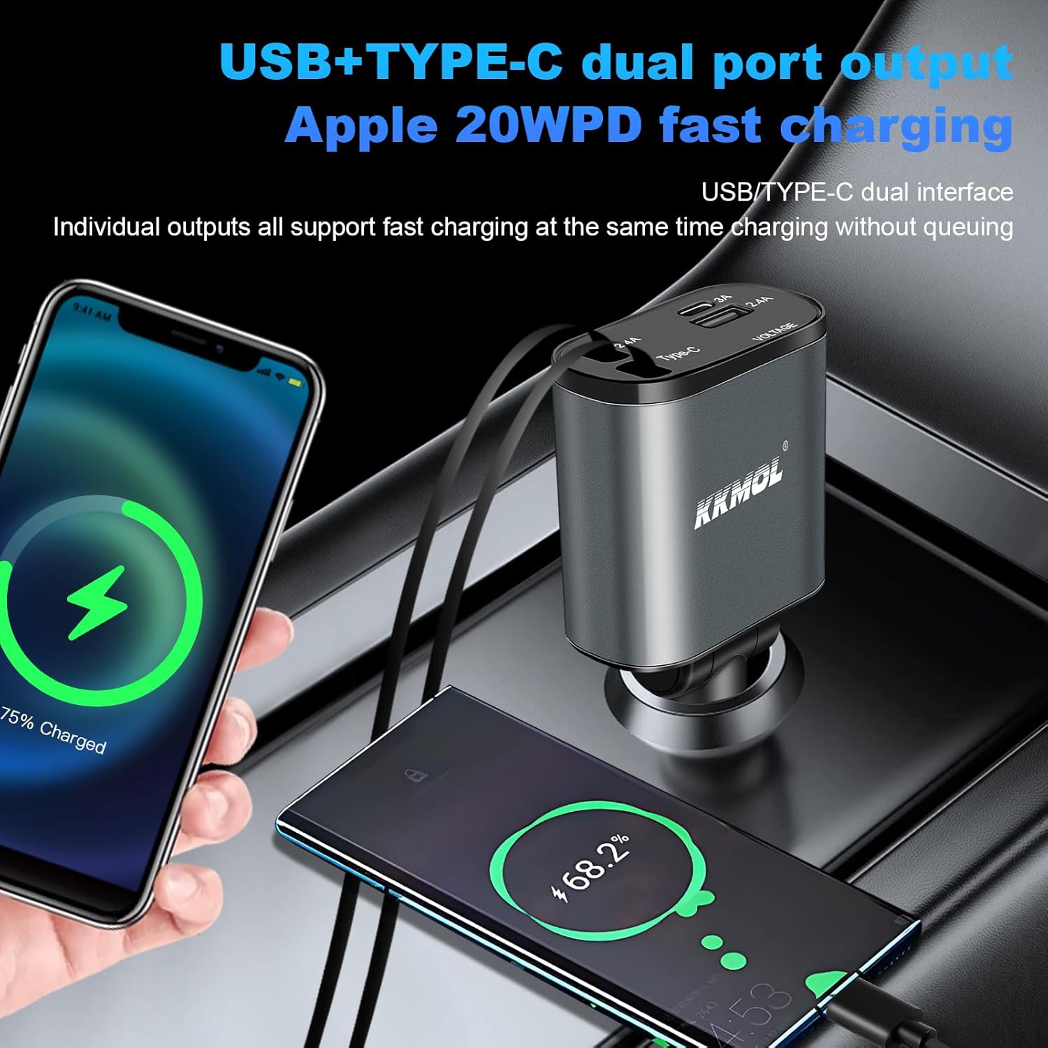 Carregador de Carro Retrátil KKMOL 4 em 1 Rápido 100W com 2 Cabos