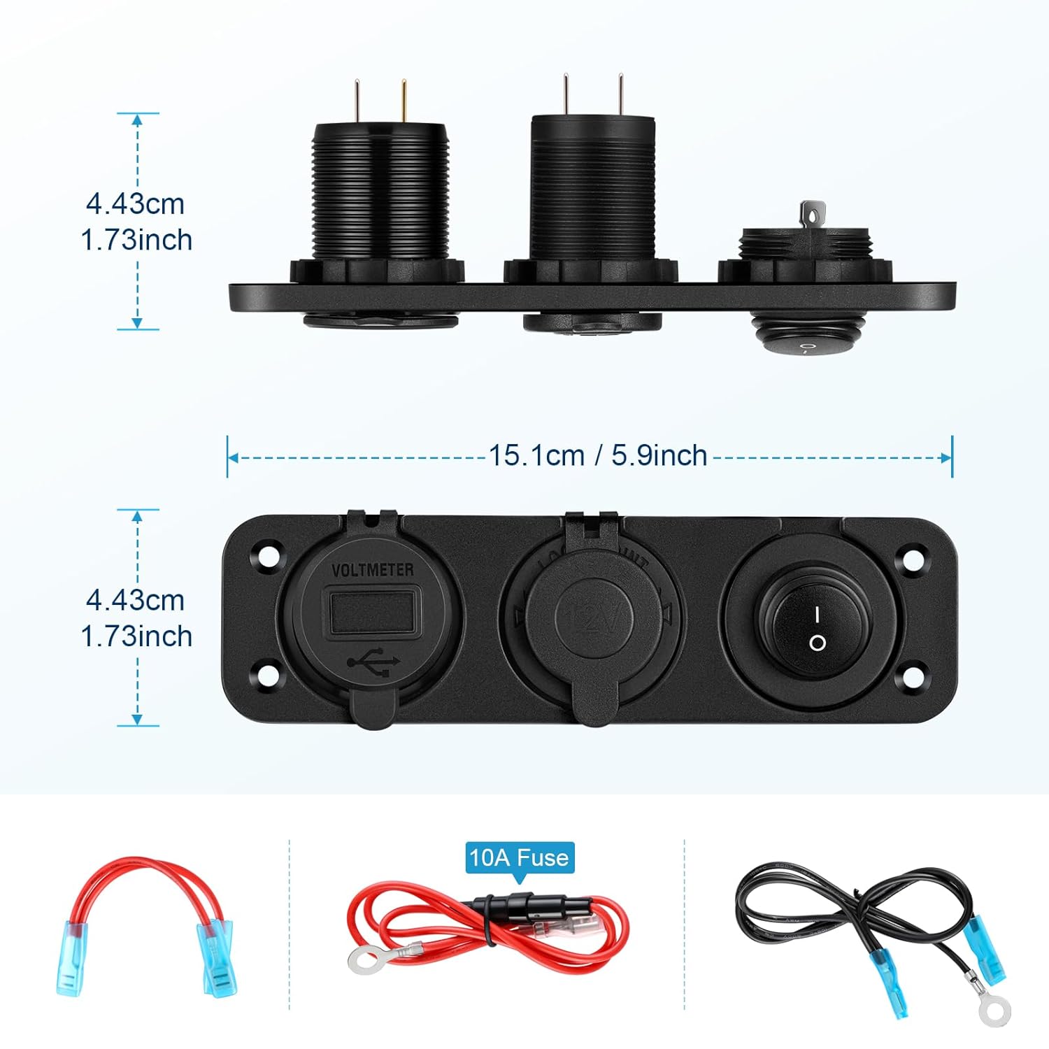 If you wire it correctly, it will turn off completely by the switch so it does not use any power when off. In my package, I found the panel, three inserts, screws, extra crimp-on terminals, and approx 18″ wires for connecting to my power system. The red wire came with an in-line fuse.