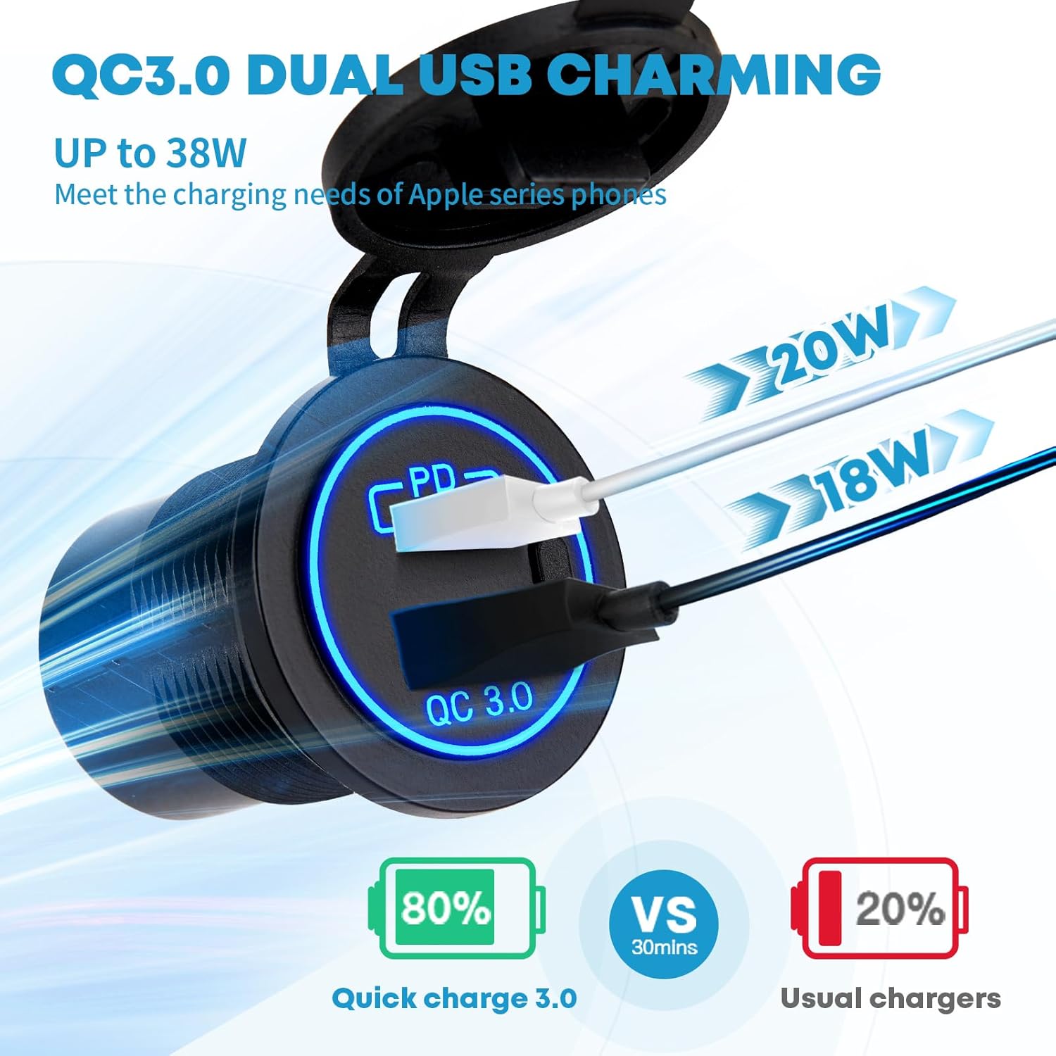 – Porto de Carregamento Eficiente QC 3.0: O soquete de energia de 12V da Kohree é desenvolvido com portas USB QC 3.0 oficiais, permitindo que dispositivos compatíveis sejam carregados até 4 vezes mais rápido do que o carregamento convencional. Com uma eficiência 40% maior que o QC 2.0, a saída máxima de 18W é perfeita para smartphones, tablets, consoles de jogos, câmeras, GPS e câmeras de painel.