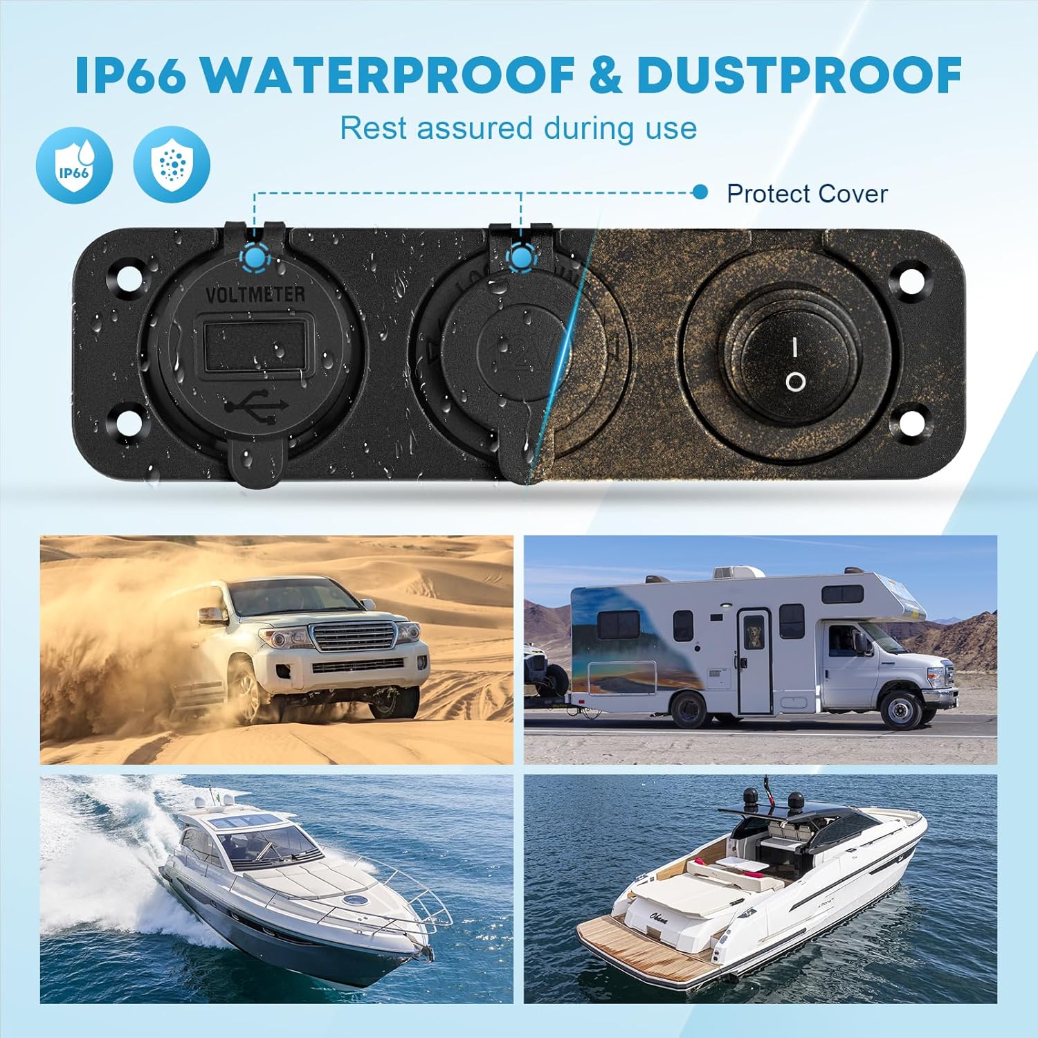 – À Prova D’Água e Poeira e Facilidade de Uso: O soquete de 12V é fabricado em material ABS, resistente ao calor e à abrasão, atendendo à classificação IP66 de impermeabilidade. O design com tampa selada protege as portas USB e o soquete do isqueiro contra poeira e água. A instalação é simples: conecte de acordo com o diagrama de fiação e ligue a um dispositivo de 12-24V para uso.