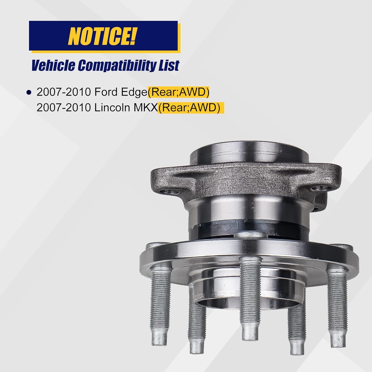- Compatibilidade do Veículo: O conjunto de rolamento e cubo de roda 512335 é compatível com o Ford Edge (traseiro; AWD) e Lincoln MKX (traseiro; AWD) dos anos de 2007 a 2010.