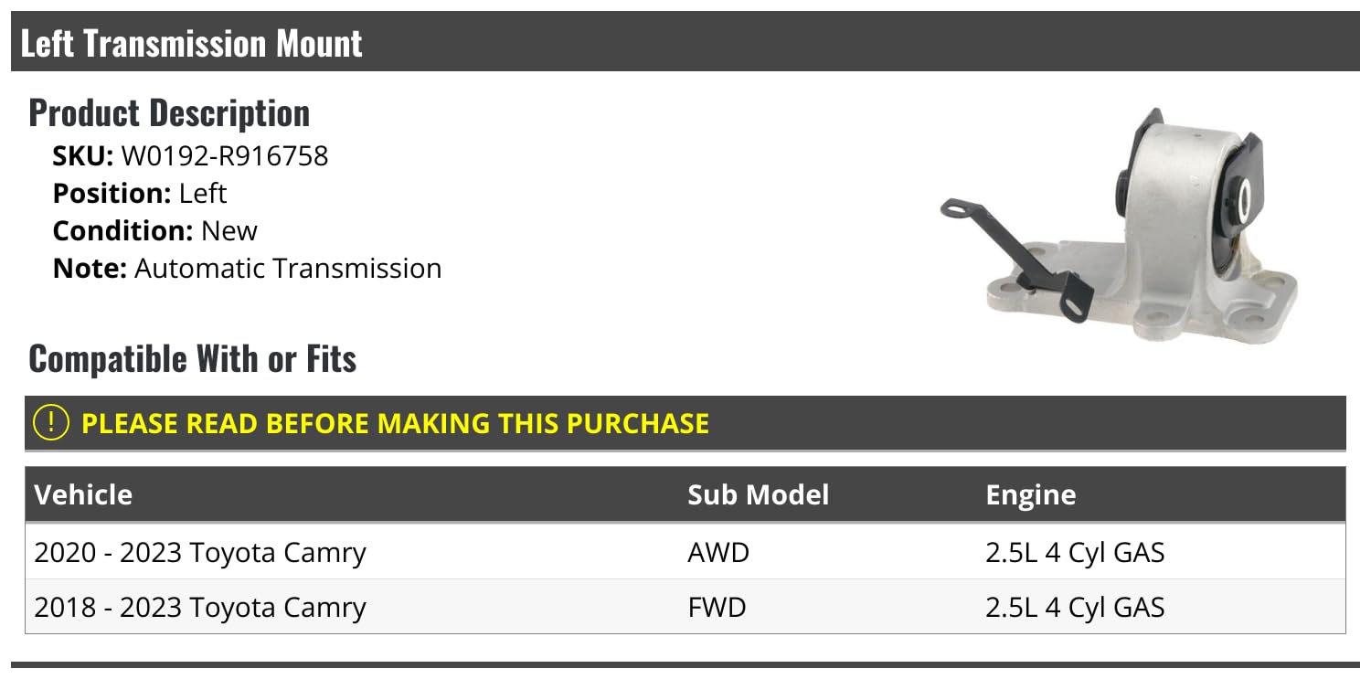 1 avaliação para Suporte de Transmissão Lado Esquerdo – Compatível com Toyota Camry 2018-2023 2.5L 4-Cilindros Gasolina (Transmissão Automática)
