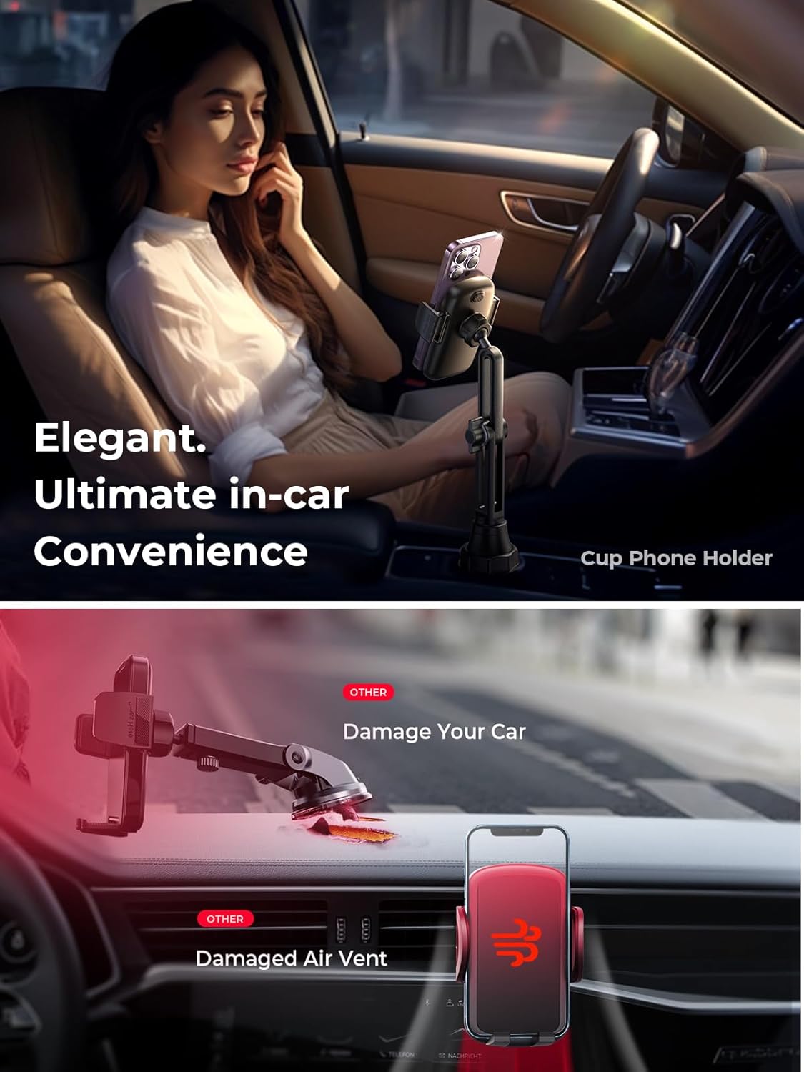 - WORK FOR ANYWHERE THAT HAS CUP HOLDERS: Com uma base expansível mais larga, o suporte pode ser ajustado de 2,6 a 4,0 polegadas, adaptando-se a todos os copos de acessórios de carro, incluindo montagens para Tesla. As almofadas de silicone anti-derrapantes e o material durável garantem que o suporte fique firmemente preso, evitando quedas e danos ao seu dispositivo.