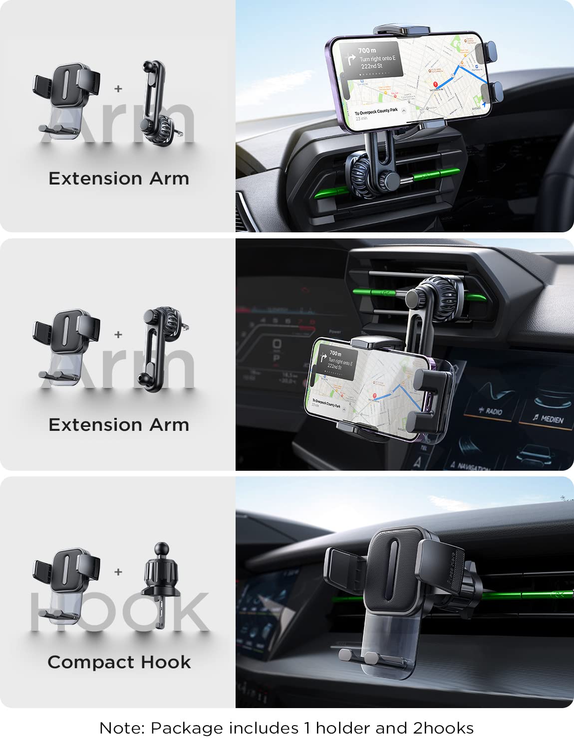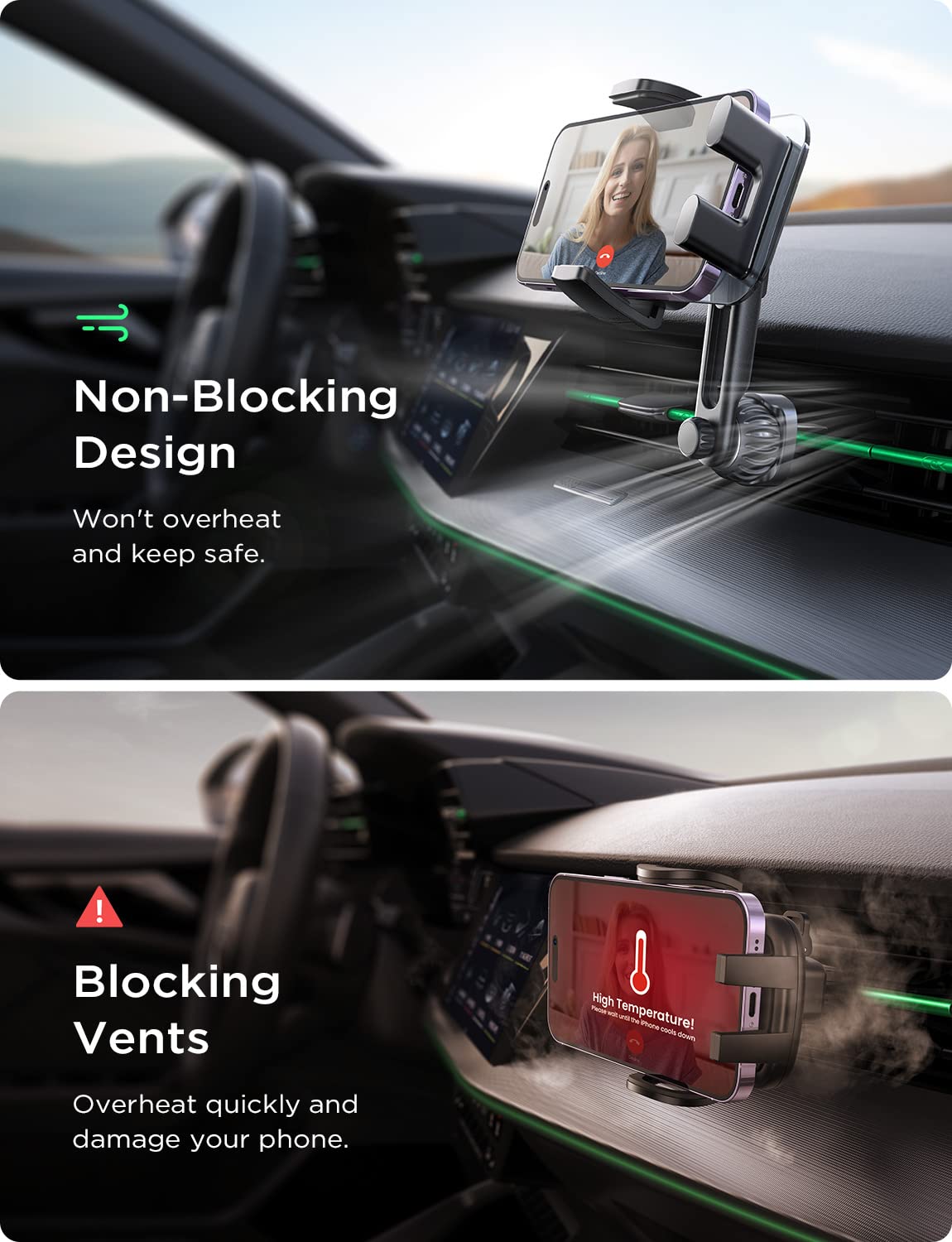 • Mais Estável, Menos Bloqueio: O laboratório da marca LISEN aprimorou este suporte de telefone para carro em três direções. Primeiro, o braço de extensão foi atualizado para proteger seu telefone contra superaquecimento. Segundo, o suporte conta com um “Gancho de Aço” que proporciona a máxima estabilidade. Por último, a força de clamping é impressionante, suportando até 48 LB (equivalente a 70 iPhones 13 Pro Max). A LISEN oferece um ano de serviço ao usuário.