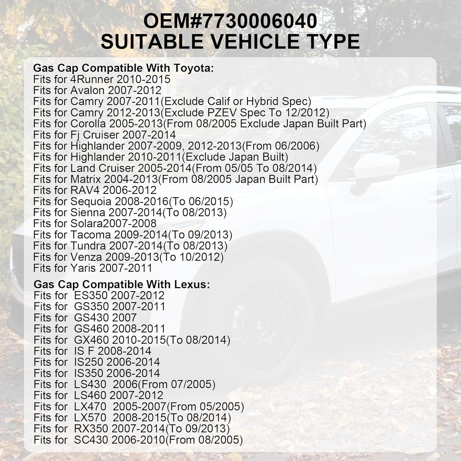 O LivTee Car Fuel Cap é a solução ideal para quem busca um tampão de combustível de alta qualidade e compatível com diversos modelos da Toyota e Lexus. Este produto é projetado para substituir o número de peça OEM#7730006040, garantindo que você tenha um encaixe perfeito e funcionalidade ideal. Antes de realizar a compra, é fundamental confirmar se o OEM do acessório é adequado para o seu veículo, assegurando a compatibilidade.