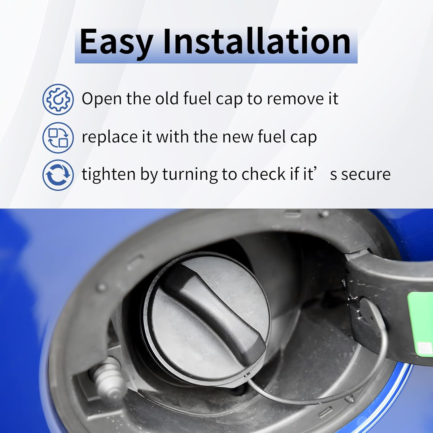 A instalação é simples e prática. Basta remover a tampa de combustível antiga, instalar a nova e apertar até ouvir um clique, assegurando um encaixe seguro.