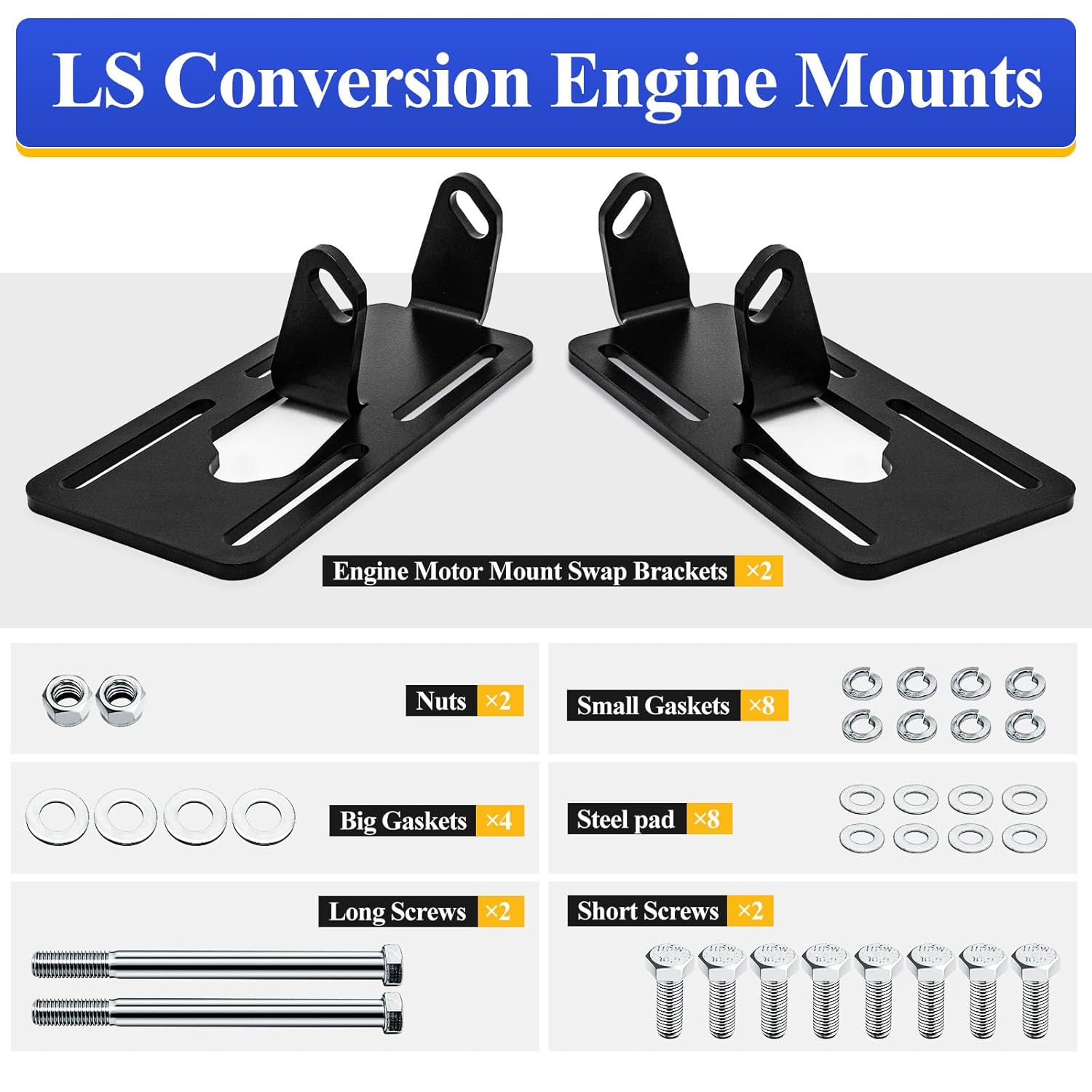 - ✔Pacote incluído: Suportes de Montagem de Motor x2, Porcas x2, juntas pequenas x8, juntas grandes x4, pads de aço x8, parafusos longos x2, parafusos curtos x2. Fácil de instalar, pode substituir diretamente peças quebradas ou desgastadas, sem necessidade de manual de instruções.