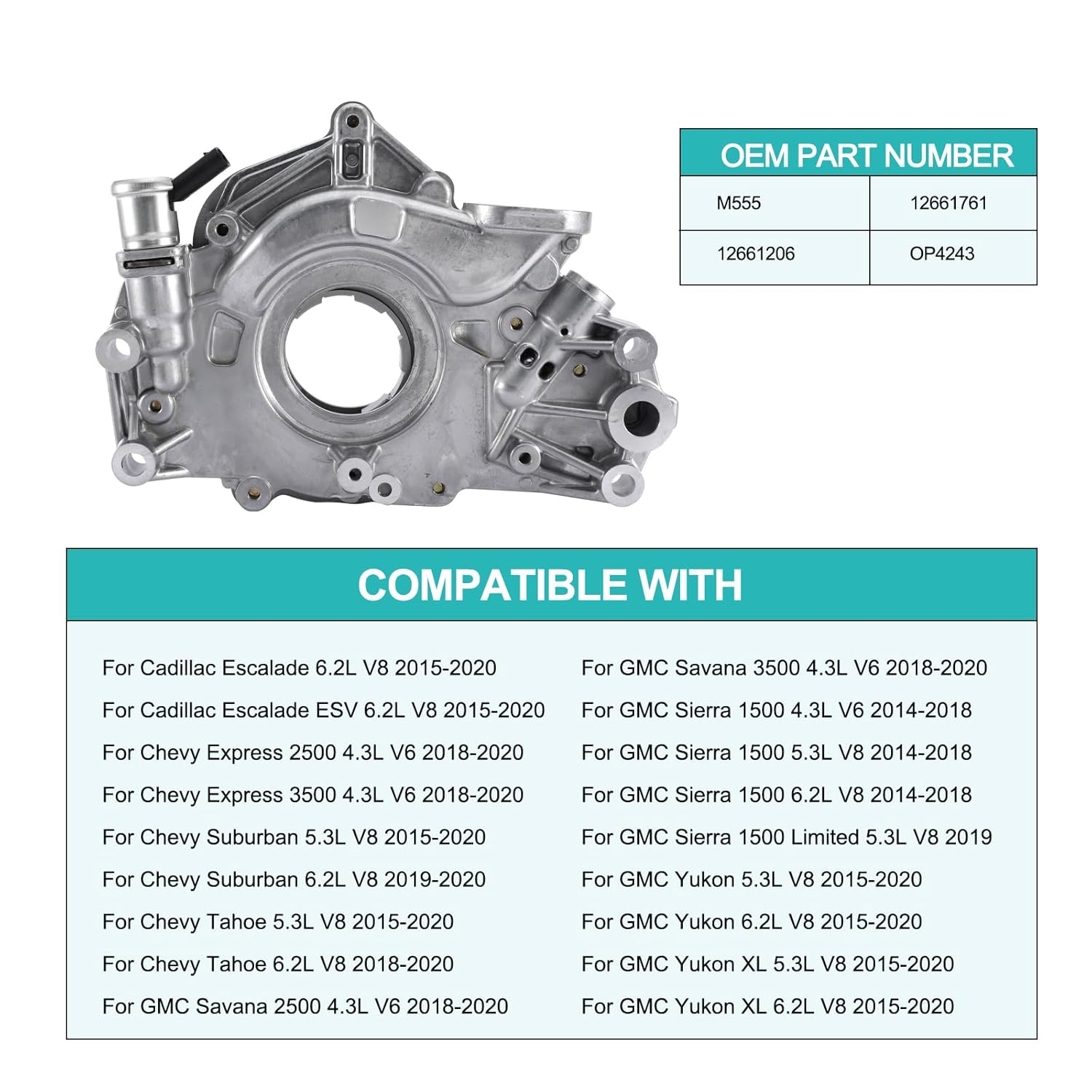 A bomba de óleo M555 12686433 é a solução ideal para quem busca um desempenho superior e confiabilidade no sistema de lubrificação de motores de alto desempenho. Compatível com uma variedade de veículos, incluindo o Cadillac Escalade ESV (2015-2020), Chevy Express (2500 e 3500, 2018-2020), Silverado (1500, 2014-2020), Suburban (2015-2020), Tahoe (2015-2020) e GMC Sierra (1500, 2014-2020), esta bomba é projetada para motores de 4.3L, 5.3L e 6.2L, garantindo uma performance excepcional em cada partida.