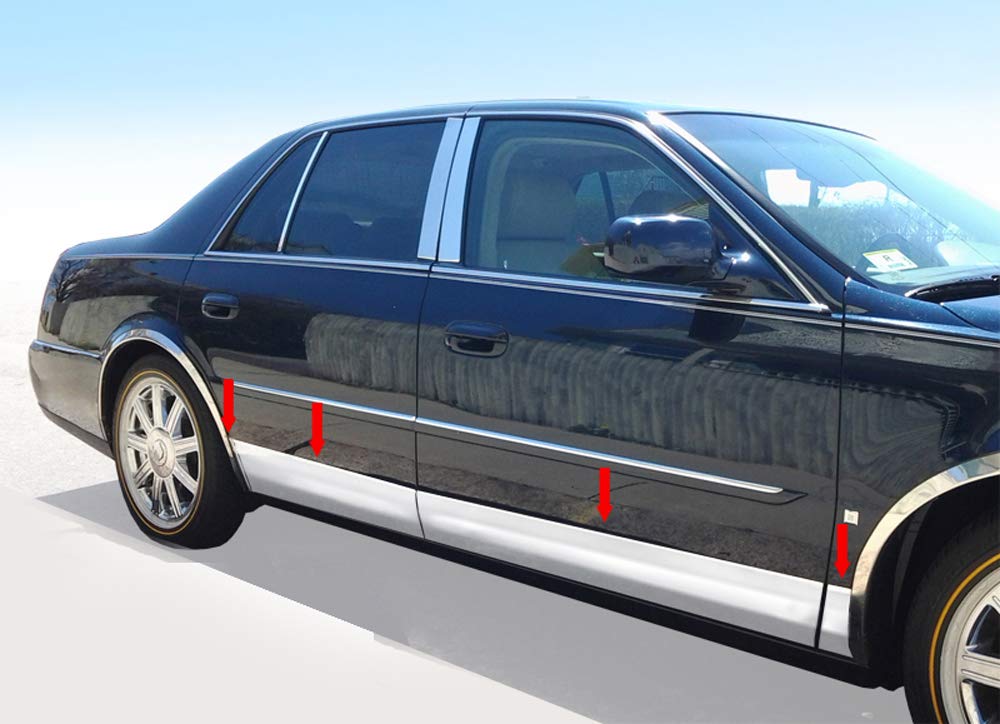 This made in USA! Works with 2000-2005 Cadillac Deville | DTS 4 Door Stainless Steel Chrome Rocker Panel Trim kit is awesome !!! its very …heavy duty & is cut PERFECTLY to fit the car. I was also VERY impressed that the ENTIRE back these trim pieces are ready to install with a full sheet of top notch 3M body tape. Clean the area that these are going to be installed with rubbing alcohol real well or glass cleaner and let it DRY completely. Then start your installtion. Once they are installed I used a heat gun to make sure the tape stuck real well. It looks amazing, and I’m VERY sure they wont be going anywhere.