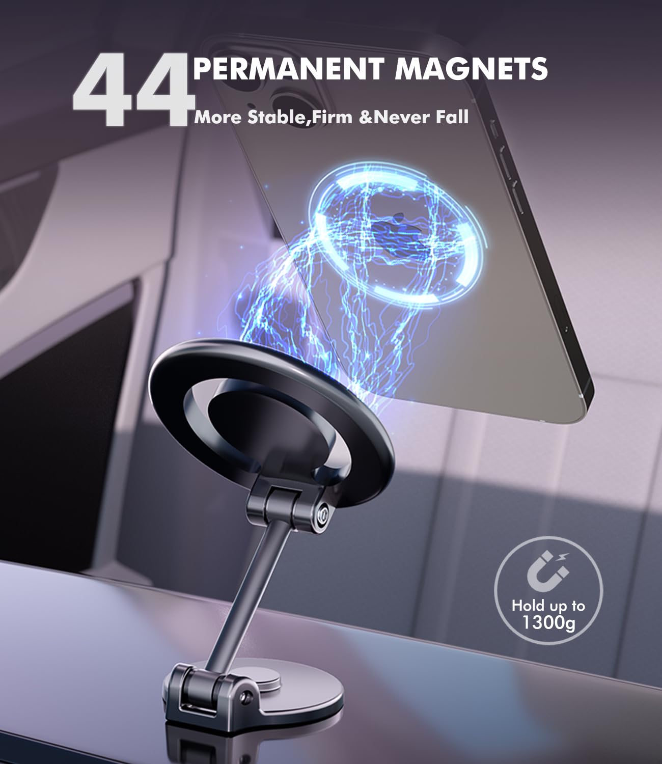 Suporte Magnético para Carro iPhone 15 14 13 12 Pro Max Mini com Capa MagSafe, Dobrável, 44 Ímãs N52, Compatível com Todos os Celulares, Preto