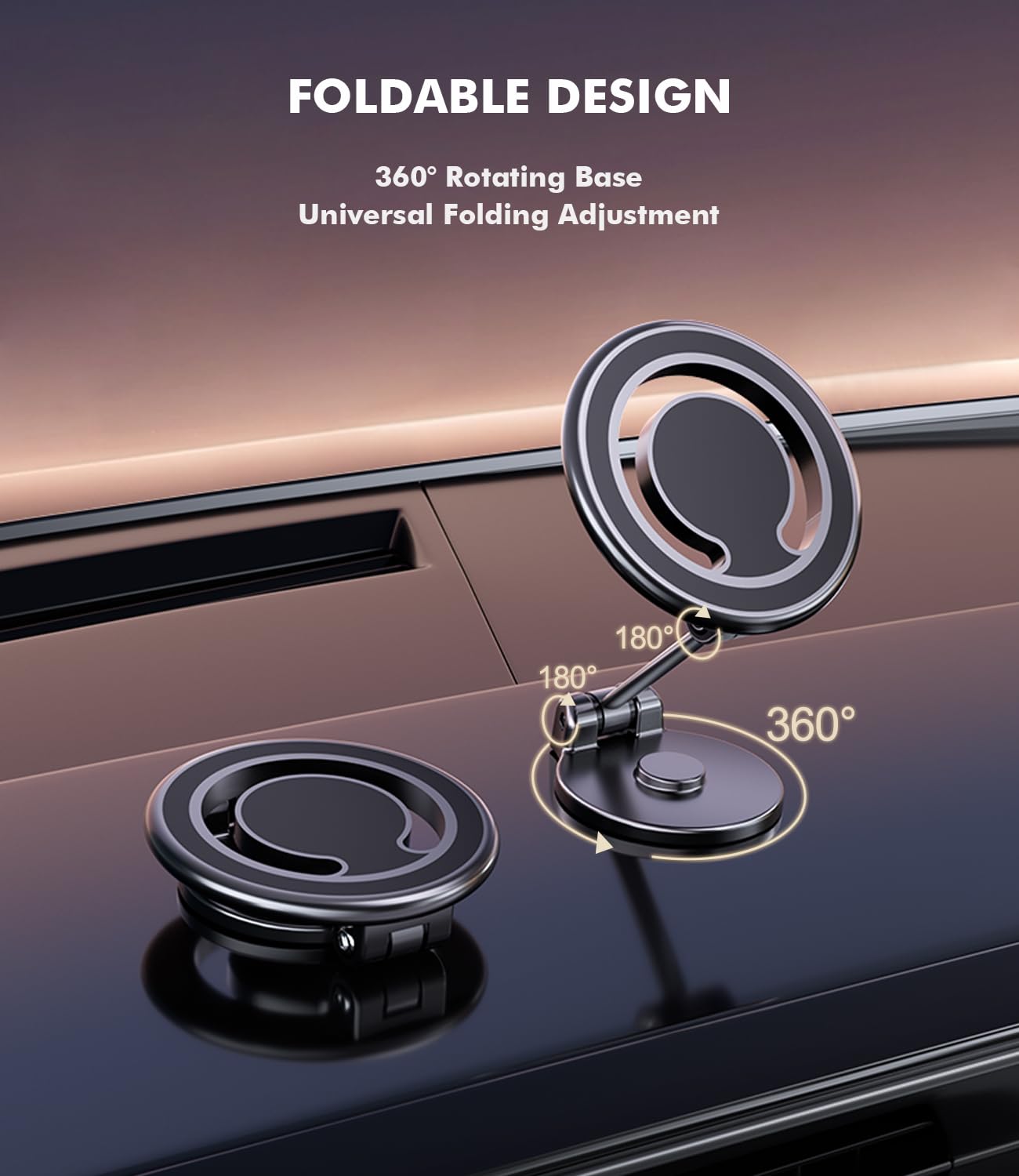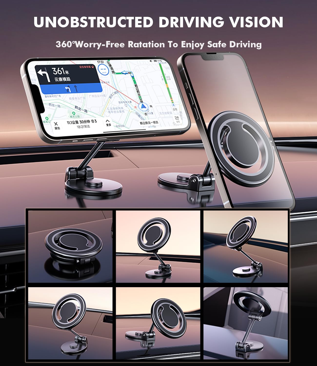 Com um design portátil e requintado, o suporte magnético é discreto quando não está em uso e pode ser dobrado, permitindo alternar entre modos vertical e paisagem. A base rotativa de 360° possibilita ajustar o ângulo de visão do seu telefone, garantindo conforto e praticidade durante a condução.
