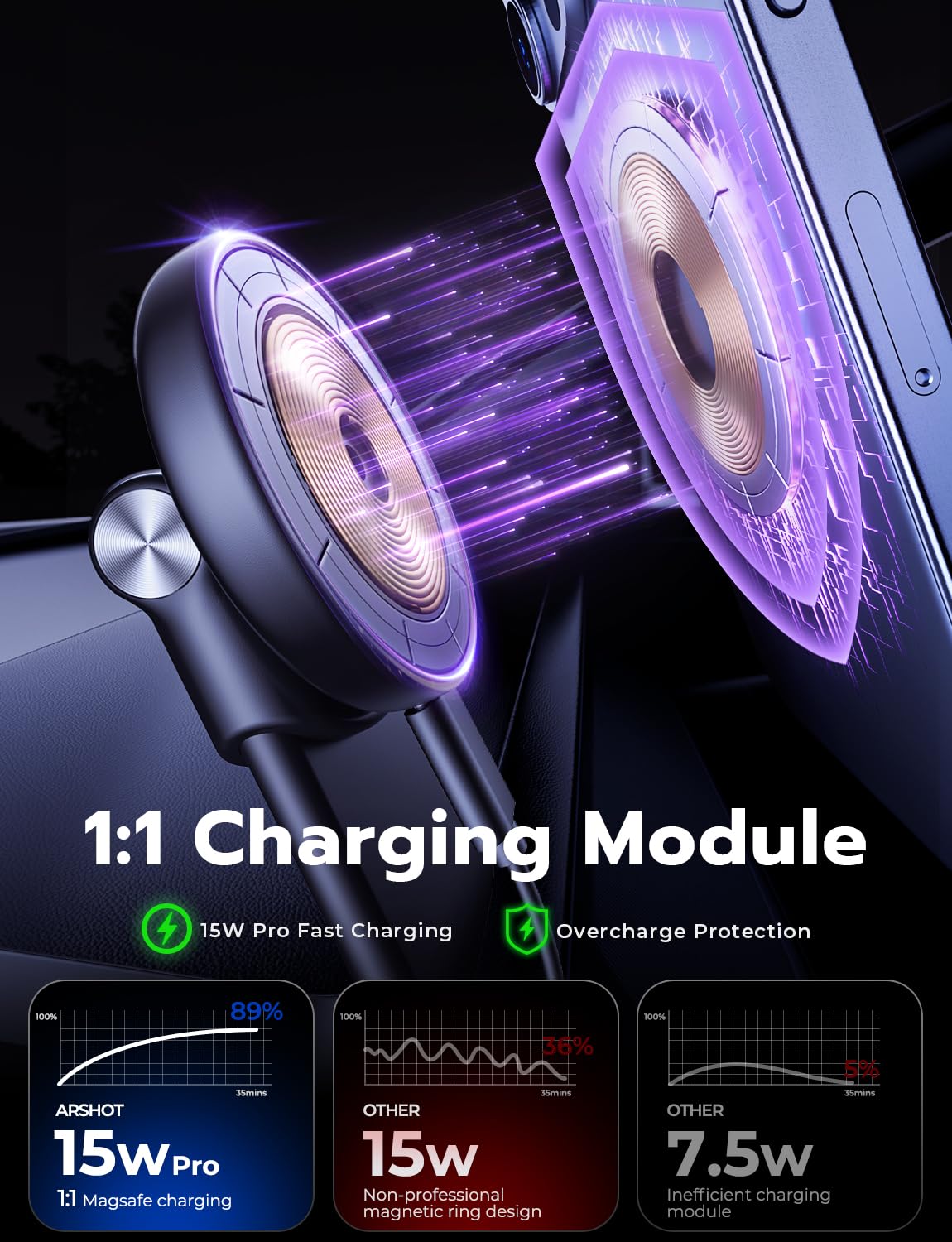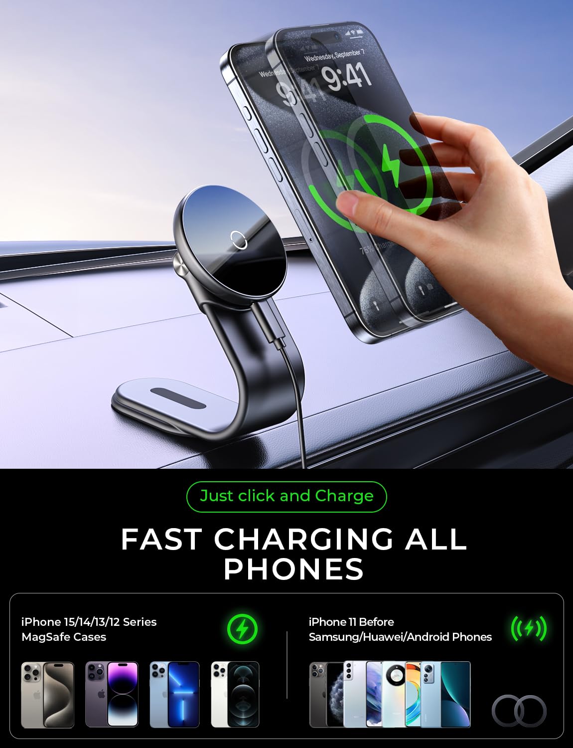 Compatível com a maioria dos smartphones que suportam carregamento sem fio, este suporte é ideal para iPhones das séries 15/14/13/12 Pro, Pro Max e Mini, tanto sem capa quanto com capas que possuem função magnética. Para iPhones 8, X, XS, XS Max e 11 com capas sem função magnética, basta aplicar o anel metálico na parte traseira do telefone para desfrutar da facilidade do “snap and go”.