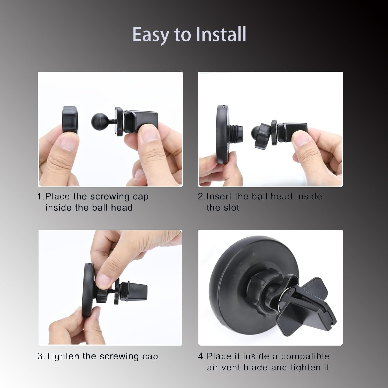 This car mount is amazing! It was very easy to put in my car on the front seat vent and even the backseat vent. The magnetic hold is really good. It charges so quickly. It is a must have for phone!