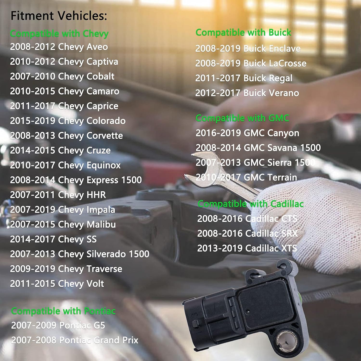 Resposta: O Sensor MAP 55573248 é compatível com diversos modelos da Chevrolet, GMC e Cadillac. Verifique a lista de compatibilidade acima para confirmar.
