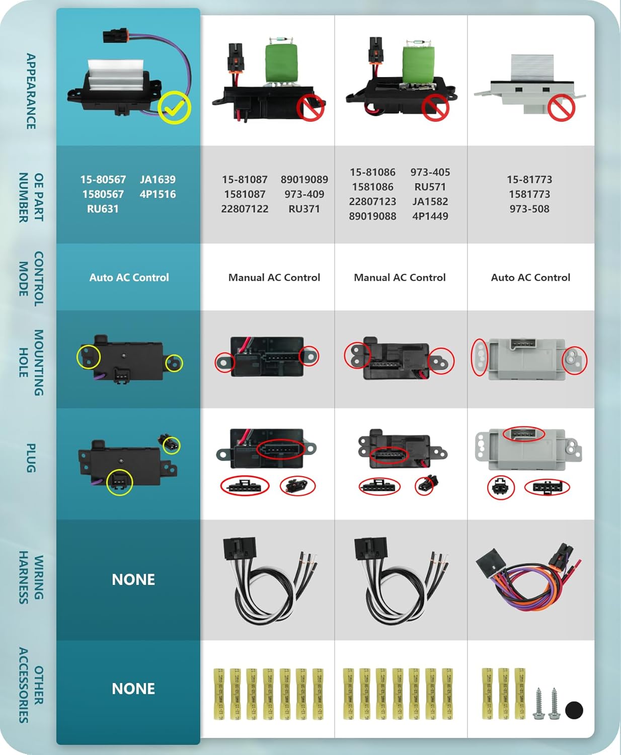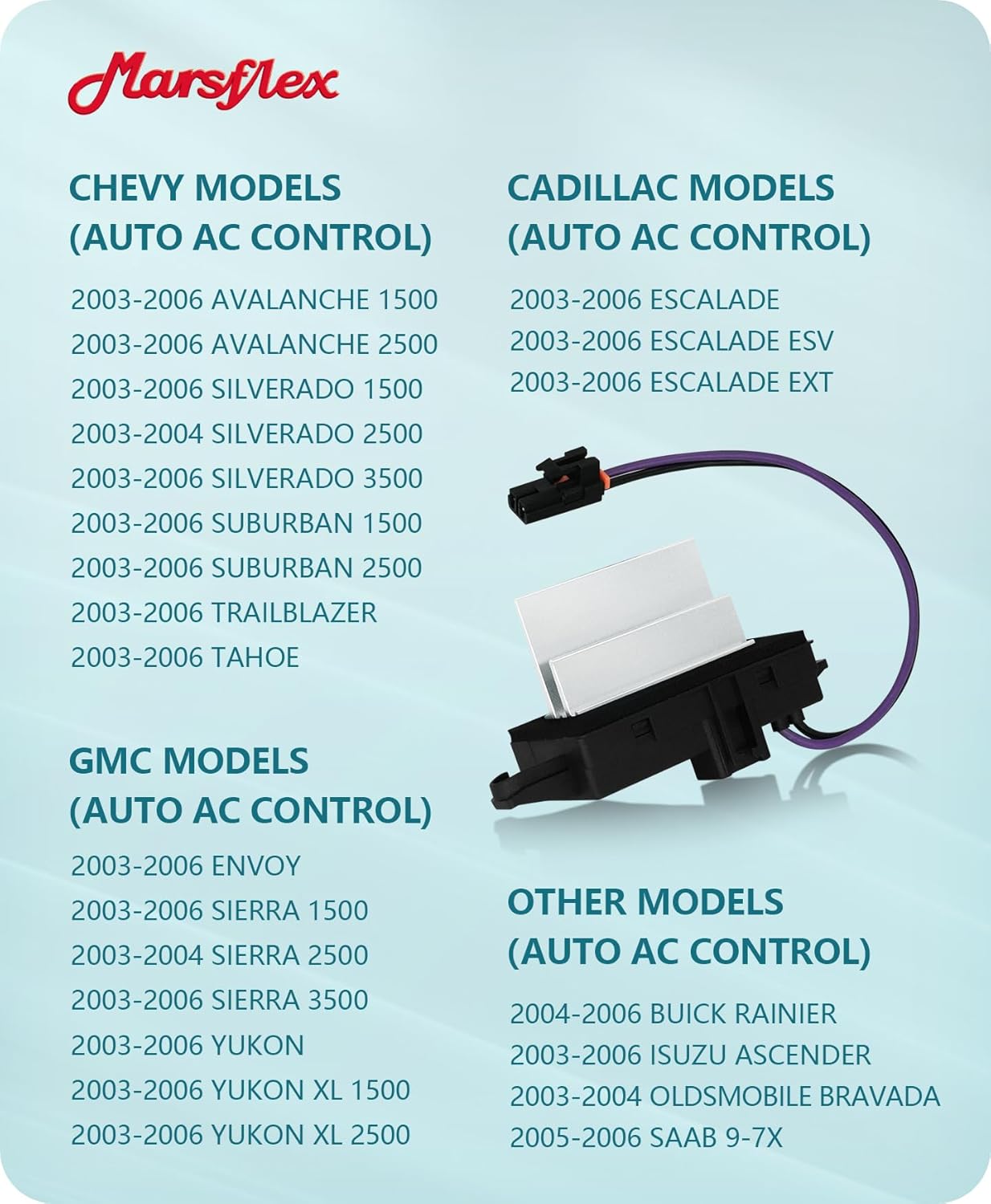 O Marsflex Blower Motor Resistor 15-80567 é um componente essencial para o sistema de aquecimento, ventilação e ar condicionado (HVAC) de diversos modelos de veículos, incluindo Chevrolet, GMC e Cadillac. Este resistor de motor de ventilador é projetado para garantir um controle preciso da velocidade do ventilador, proporcionando conforto e eficiência no uso do ar condicionado do seu carro. Antes de realizar a compra, é fundamental verificar a aparência do resistor do ventilador em seu veículo e confirmar se o número da peça original (OE) é compatível com o resistor que você está adquirindo. O Marsflex é compatível com os seguintes modelos: