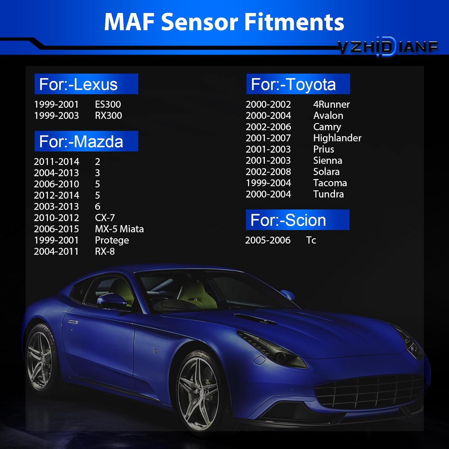 O Sensor de Fluxo de Ar Massivo (MAF) 22204-21010 é uma peça essencial para o desempenho ideal do motor de diversos modelos de veículos, incluindo Toyota Tacoma, 4Runner, Camry, Prius, Tundra, Highlander, Solara, Lexus ES300, RX300, e Mazda 3, 5, 6, CX-7, RX-8. Este sensor é projetado para substituir diretamente as peças originais, garantindo uma instalação fácil e sem complicações.