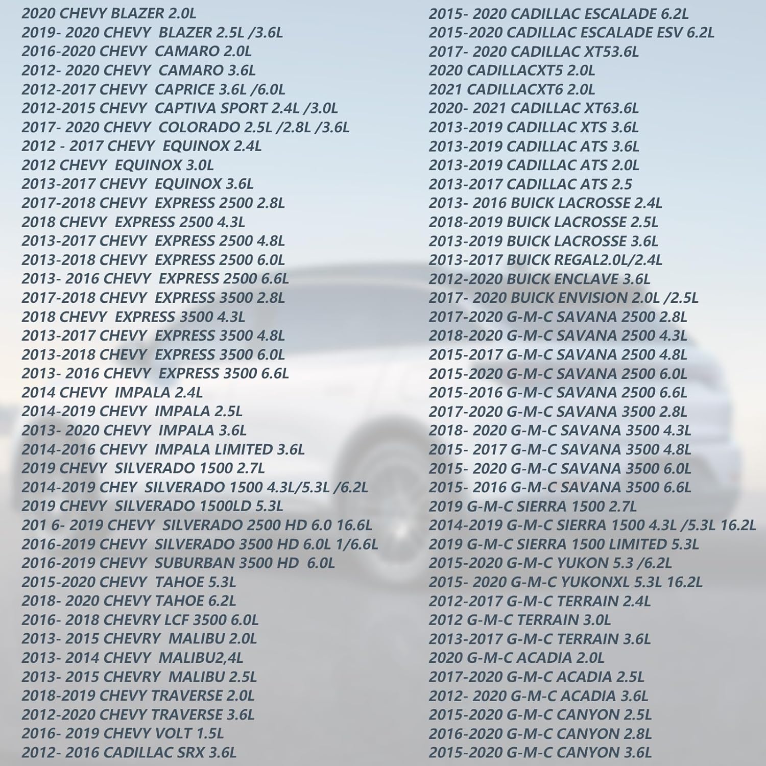 – Chevy: 2012-2015 Captiva Sport, 2015-2018 Colorado, 2014-2019 Silverado 1500, 2015-2019 Suburban, 2016-2018 Express 3500, 2015-2018 Tahoe, 2012-2019 Traverse, 2012-2017 Impala, 2012-2019 Camaro.