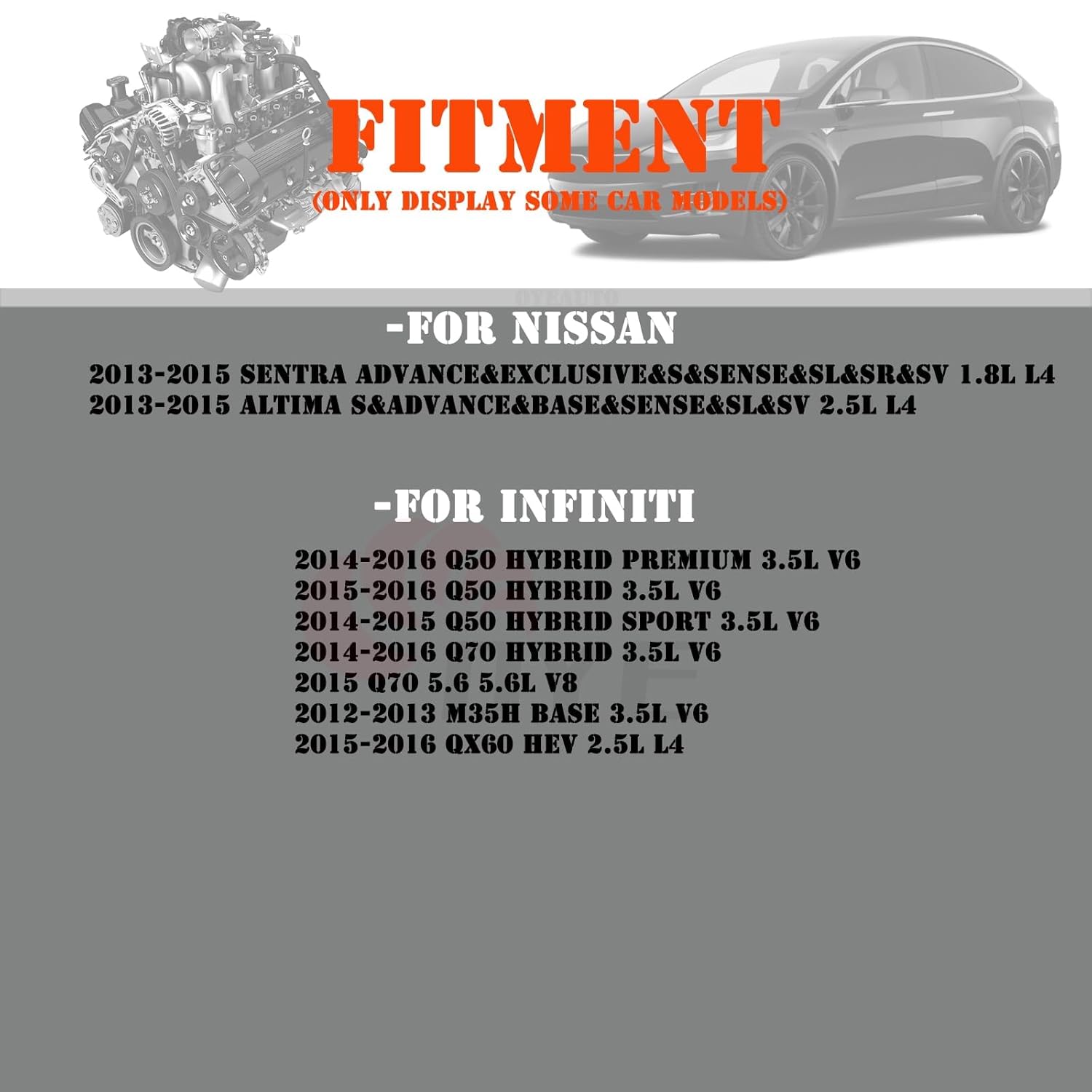 – Modelos Compatíveis: Nissan Sentra, Altima (S, Advance, Sense, SL, SV, Base, Exclusive, SR) de 2013 a 2015 com motores 1.8L e 2.5L L4. Para INFINITI Q50, QX60, Q70, M35h (Hybrid e Hybrid Premium) de 2014 a 2016, e outros modelos como Base 2012-2013, HEV 2015-2016, Hybrid Sport 2014-2015, e motores 5.6L de 2015.