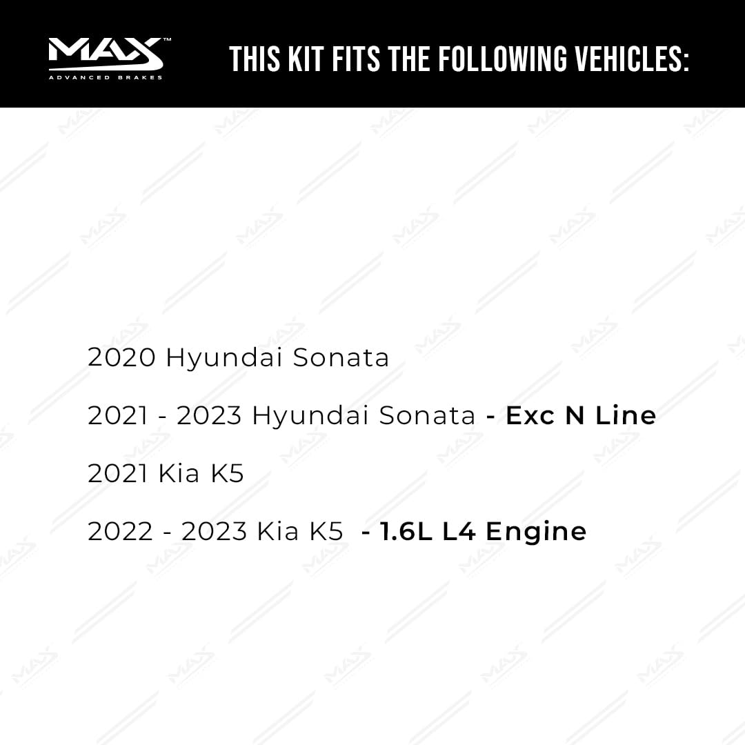 O Max Advanced Brakes Front é compatível com os modelos 2020 Hyundai Sonata, 2021 Sonata Exc N Line, 2021 Kia K5 e 2022-2023 K5 com motor 1.6L L4, assegurando que você tenha a peça certa para o seu veículo.
