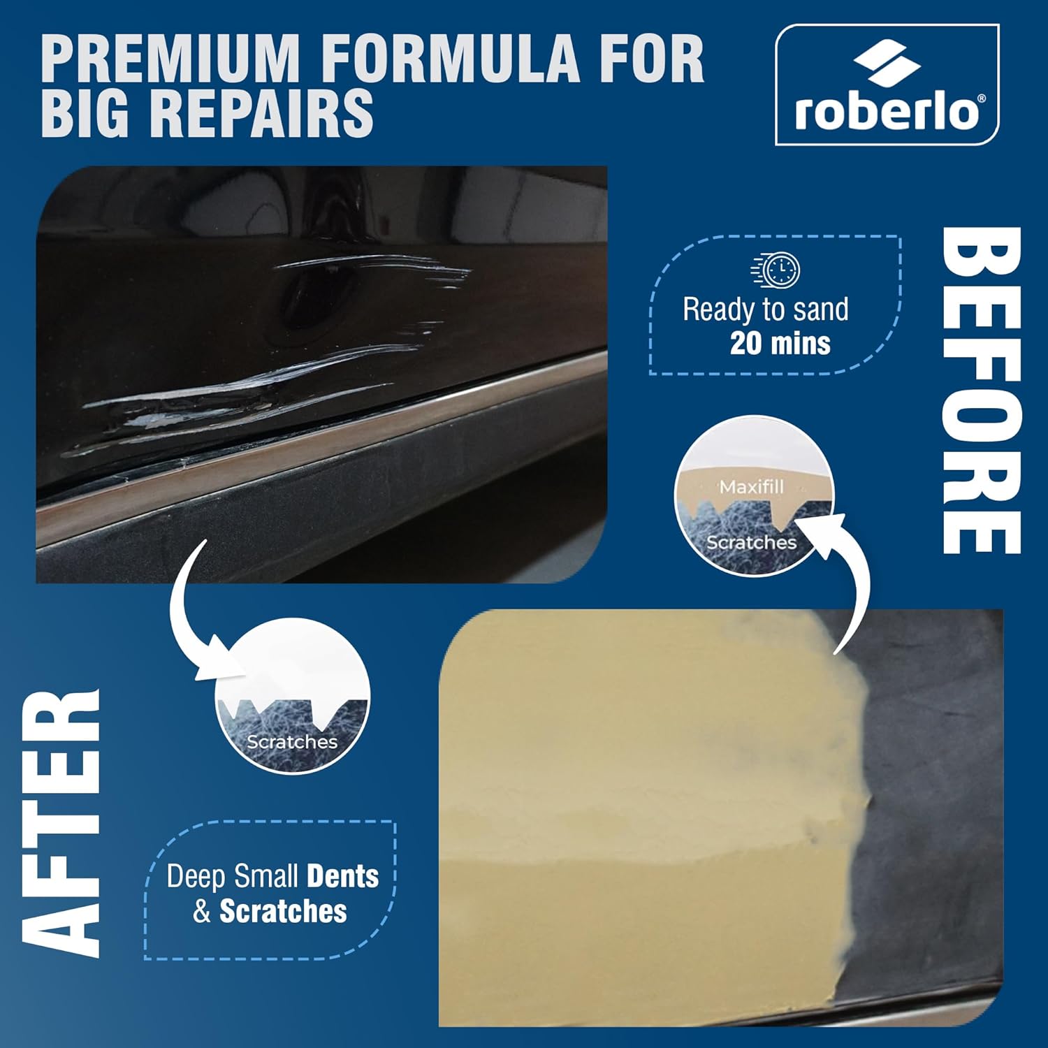 Materiais de alta qualidade: Fabricado com materiais premium, o Roberlo Maxifill adere perfeitamente a superfícies de fibra de vidro, metal, plástico e muito mais. Suas propriedades pintáveis e flexíveis permitem uma fusão perfeita com as superfícies existentes. Este enchimento para carros é reforçado para maior durabilidade, proporcionando reparos confiáveis e de longa duração.