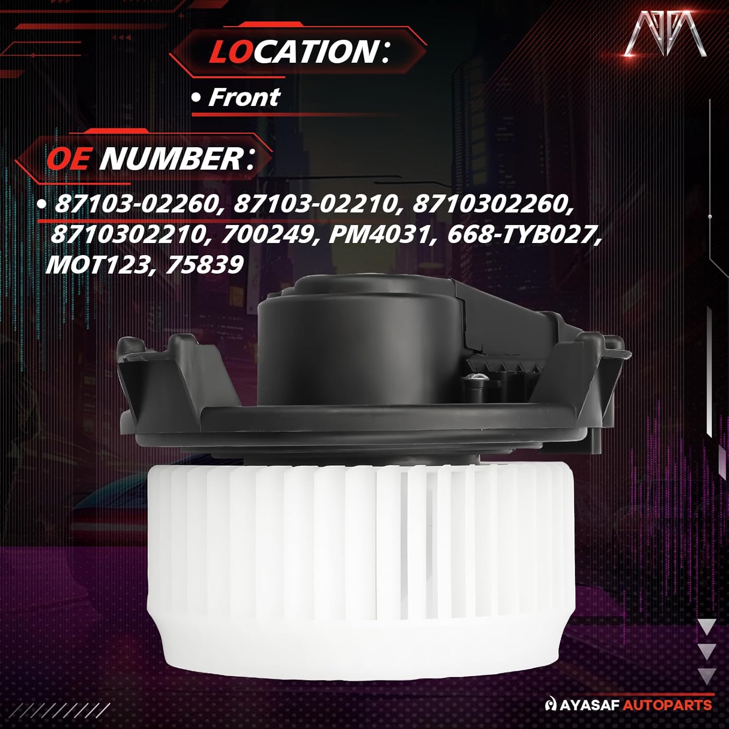 Função e Substituição: Este motor de ventilador desempenha um papel crucial na climatização do veículo, garantindo que o ar gerado pelo sistema de aquecimento ou ar-condicionado seja distribuído uniformemente. Se você notar que o fluxo de ar nos dutos está baixo ou inexistente, ou se a velocidade do motor estiver reduzida, é hora de considerar a substituição do motor do ventilador. O MAYASAF 700249 é uma alternativa confiável, substituindo os números de peça OEM: 700249, 87103-02260, 87103-02210, 8710302260, 8710302210, PM4031, 668-TYB027, MOT123, 75839.