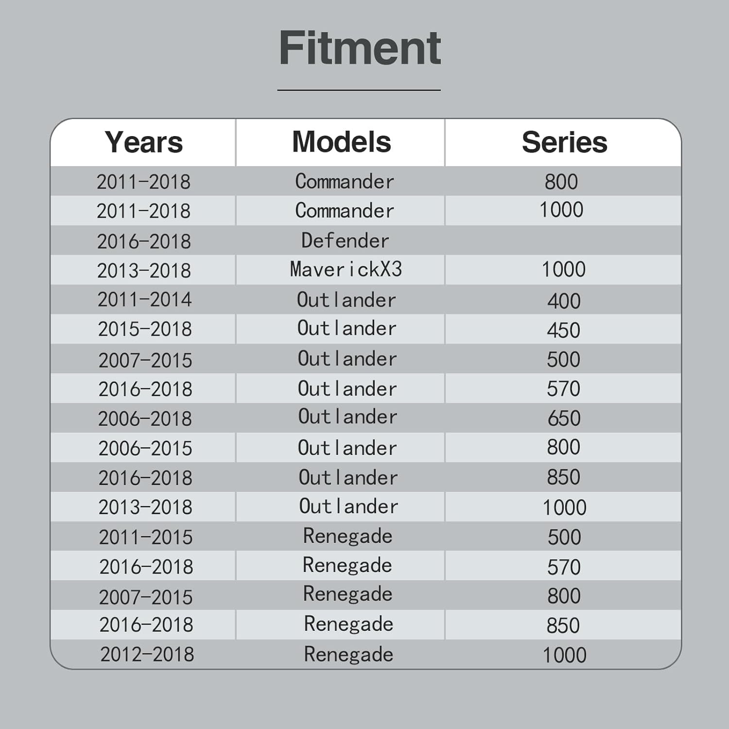 - Adequação: Compatível com diversos modelos de ATV/UTV da Can-Am, incluindo 2011-2018 Commander 800/1000; 2016-2018 Defender; 2013-2018 Maverick/X3 1000; 2011-2014 Outlander 400; 2015-2018 Outlander 450; 2007-2015 Outlander 500; 2016-2018 Outlander 570; 2006-2018 Outlander 650; 2006-2015 Outlander 800; 2016-2018 Outlander 850; 2013-2018 Outlander 1000; 2011-2015 Renegade 500; 2016-2018 Renegade 570; 2007-2015 Renegade 800; 2016-2018 Renegade 850; 2012-2018 Renegade 1000.