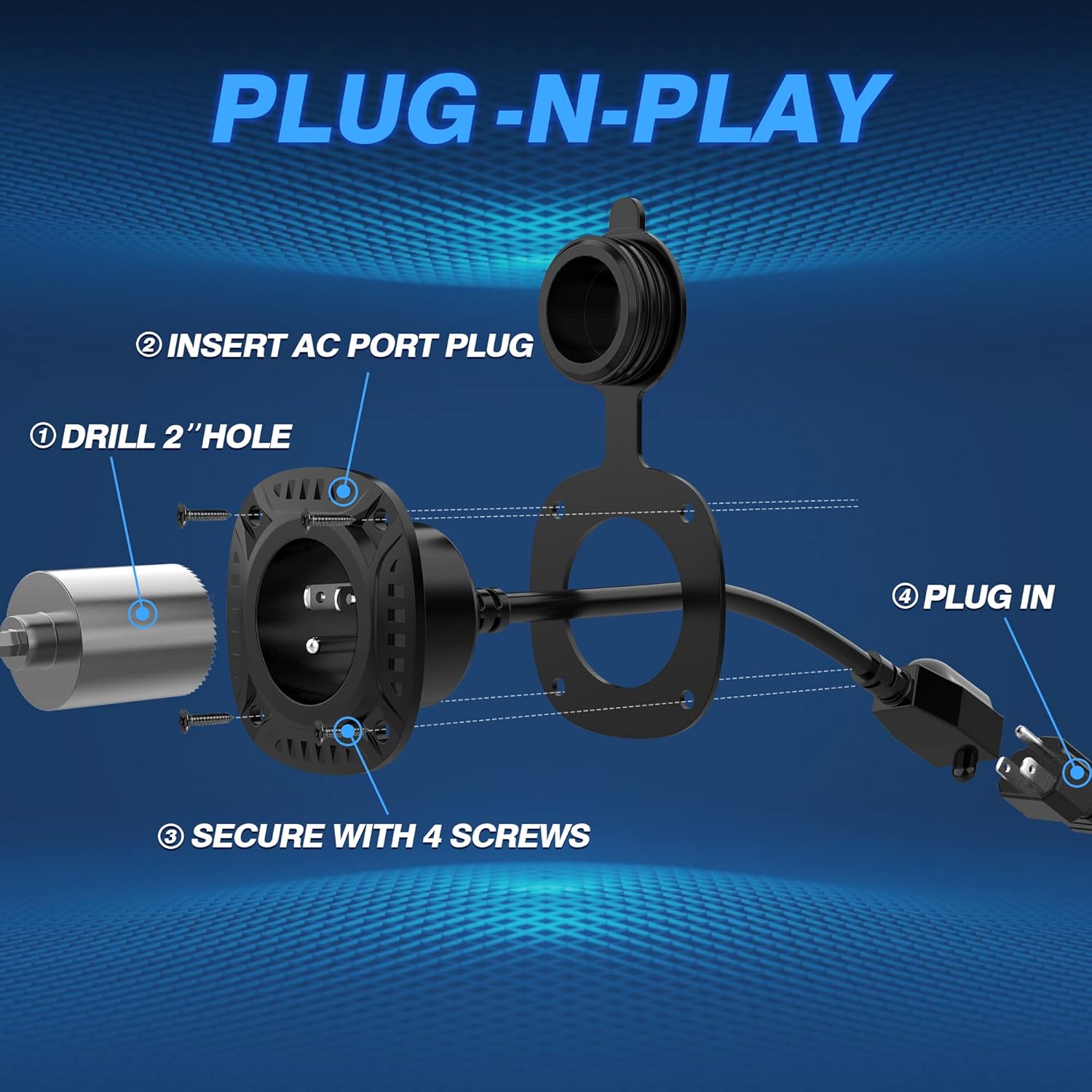 Com um cabo de extensão integrado de 16 polegadas, você terá flexibilidade suficiente para conectar diretamente à fonte de energia existente, sem complicações. A instalação é simples e rápida, sem necessidade de fiação adicional ou modificações no cabo. Basta fazer um furo de 2 polegadas e fixar o plugue com 4 parafusos, resultando em uma aparência OEM limpa e profissional.