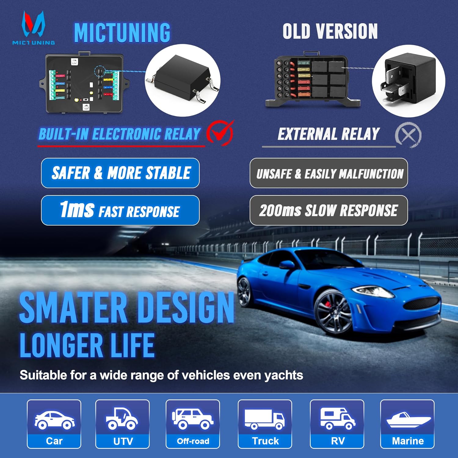 - Painel de Controle Auxiliar Tudo-em-Um: O painel MICTUNING é equipado com 8 interruptores, incluindo 3 botões de silicone que oferecem uma operação mais conveniente. Os botões possuem função de memória, ajuste de brilho e ciclo de cor única, permitindo uma experiência de uso superior em comparação com outros painéis disponíveis no mercado. Com 3 modos de iluminação (luz constante, momentânea e estroboscópica), você pode ajustar conforme suas necessidades.