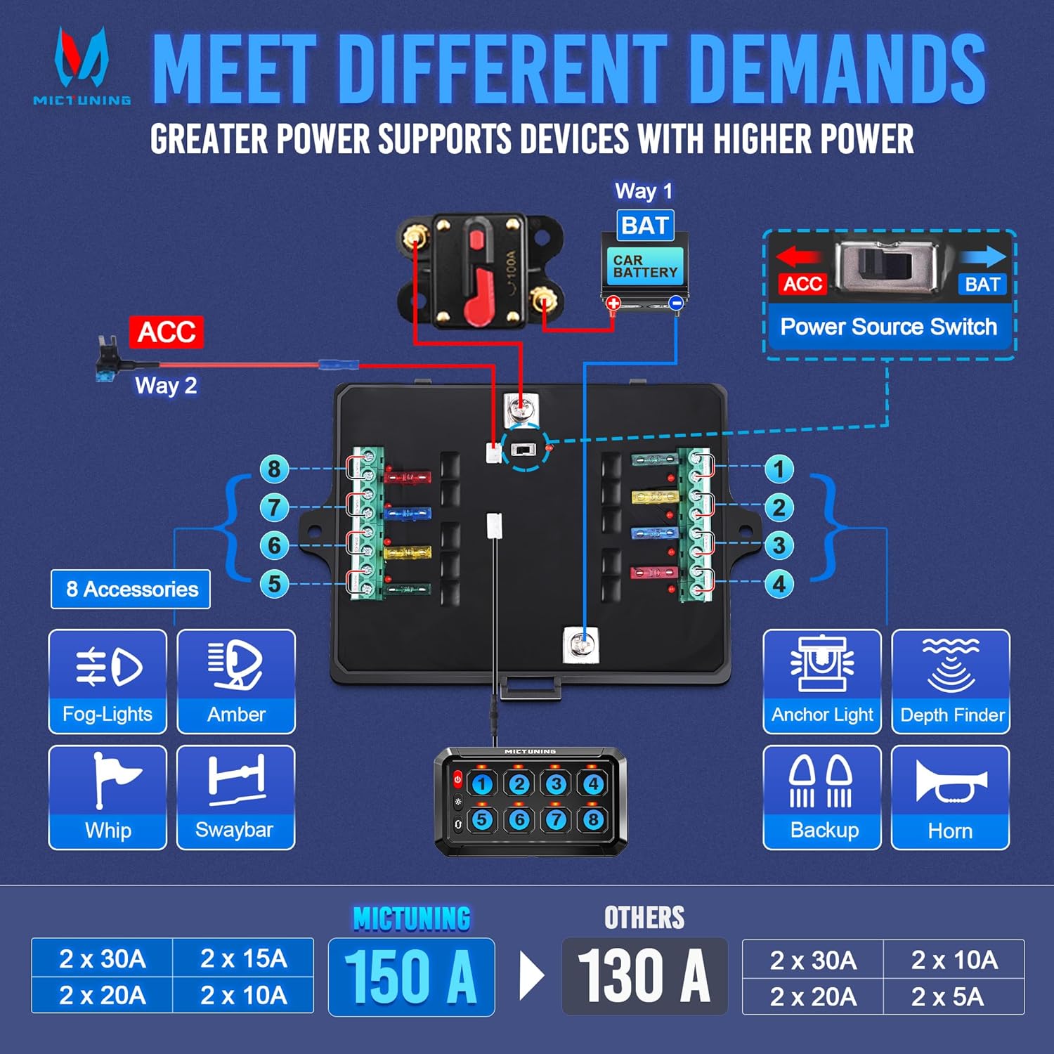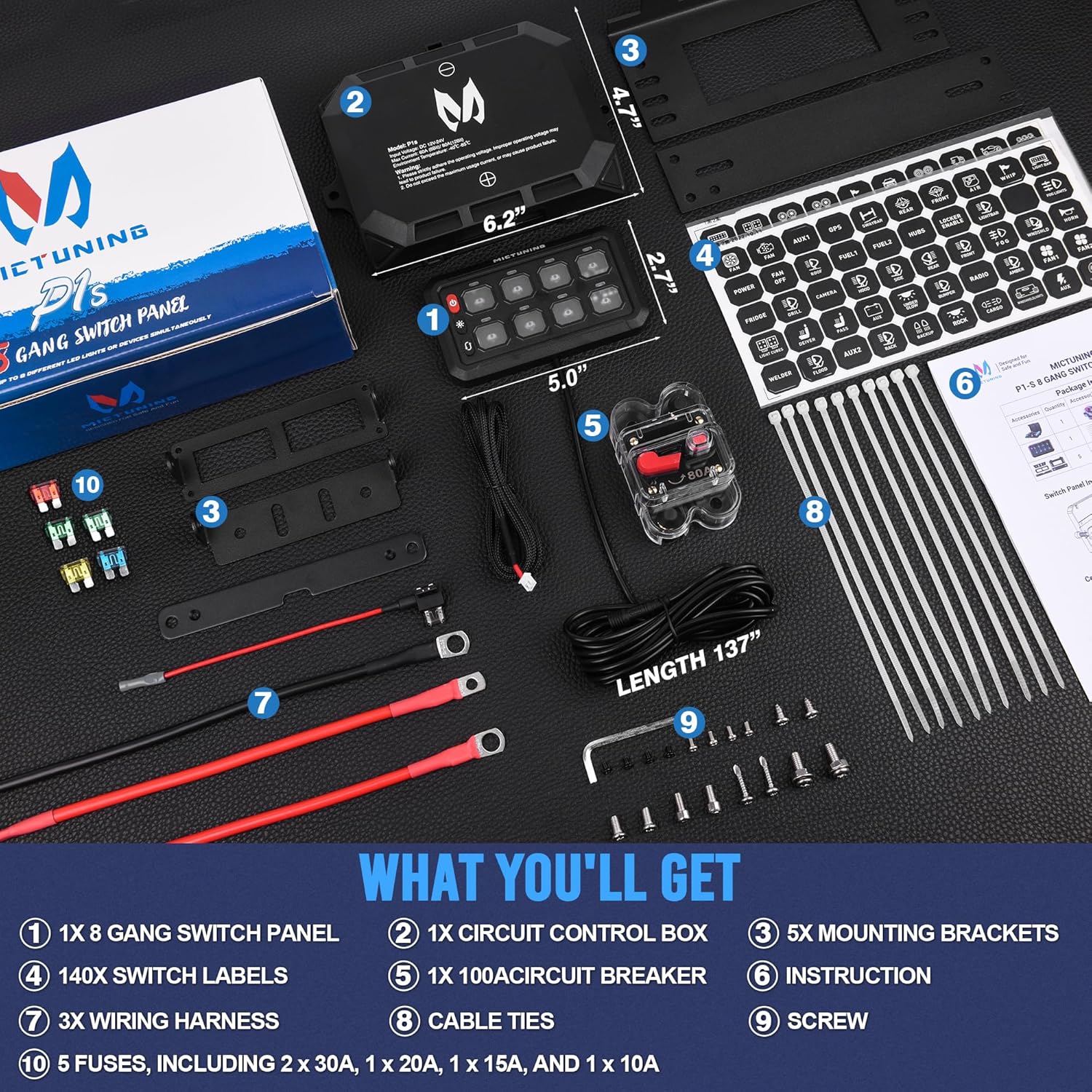 O MICTUNING 8 Gang Switch Panel P1S-B08 é a solução definitiva para quem busca um painel de controle auxiliar versátil e eficiente para veículos como campers, RVs, ATVs, SUVs, UTVs, caminhões, carros e embarcações. Com um design inovador e recursos avançados, este painel de 5 polegadas é ideal para quem deseja otimizar a operação de diversos dispositivos elétricos de forma prática e segura.