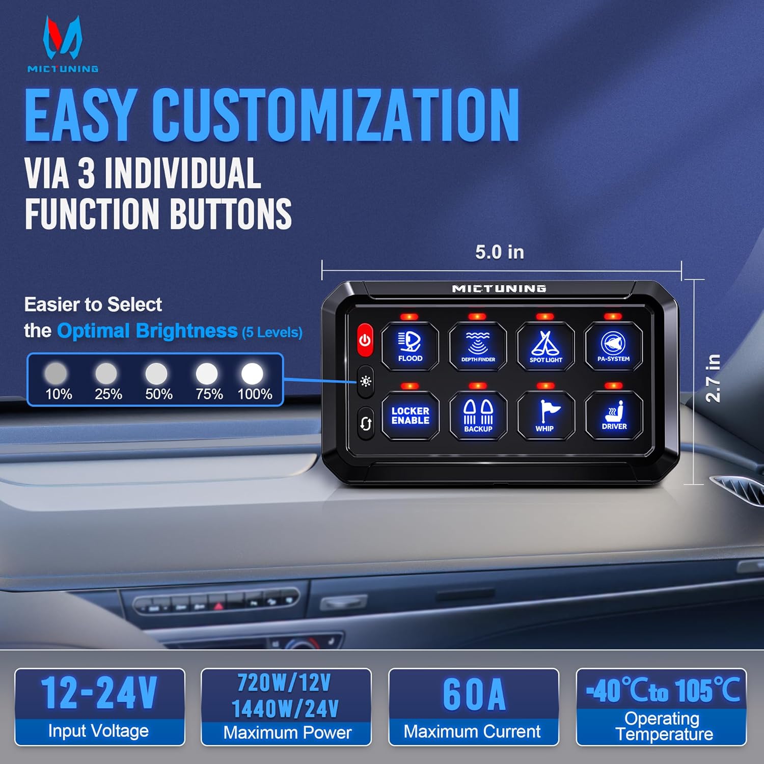 - Função Dimerizável: Diferente dos painéis comuns, o MICTUNING possui ajuste manual de brilho em 5 níveis (100%, 75%, 50%, 25%, 10%). A luz é suave e não ofusca a visão, permitindo que você ajuste o brilho conforme necessário, melhorando significativamente sua experiência de condução off-road, tanto de dia quanto à noite.
