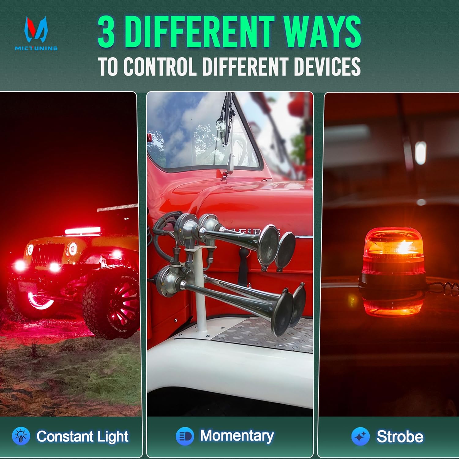 - Painel de Interruptores Auxiliar Tudo-em-Um: O painel MICTUNING é atualizado com 3 botões de silicone que incluem função de memória, ajuste de brilho e ciclo de cor única. Esses botões permitem uma operação mais conveniente, mesmo em condições de baixa visibilidade. Com 3 modos de iluminação (luz constante, momentânea e estroboscópica), você pode ajustar a configuração de acordo com suas necessidades específicas.