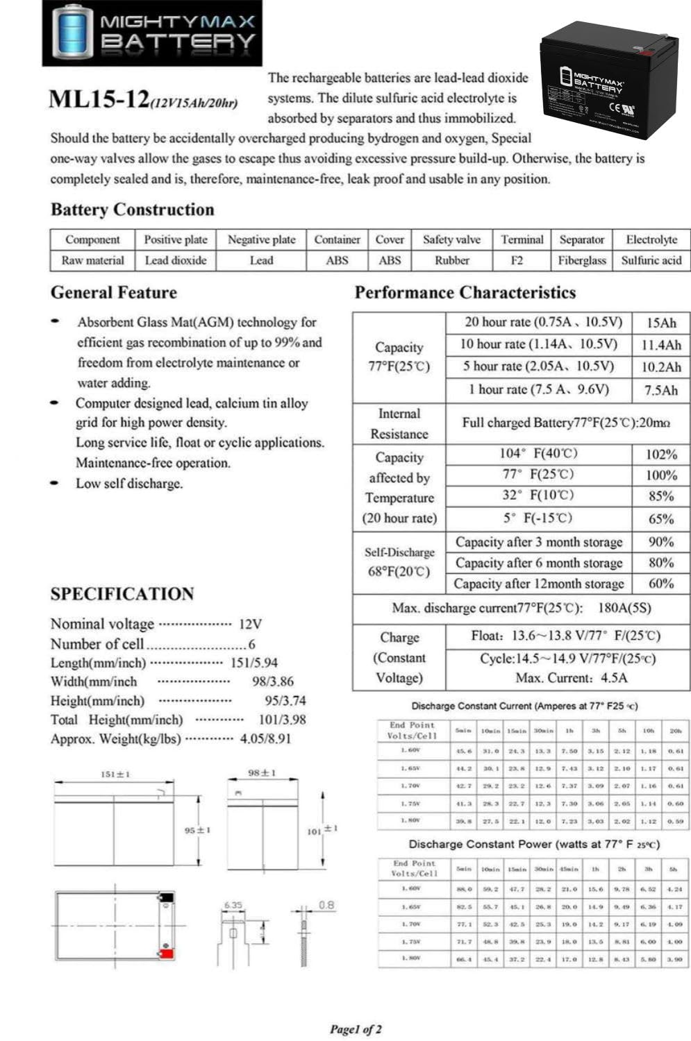 Com dimensões compactas de 5.94 polegadas x 3.86 polegadas x 3.98 polegadas e terminais do tipo F2, a ML15-12 é ideal para uma variedade de dispositivos que exigem uma fonte de energia estável e duradoura. É importante notar que a listagem refere-se apenas à bateria, sem incluir chicotes de fios ou acessórios de montagem.