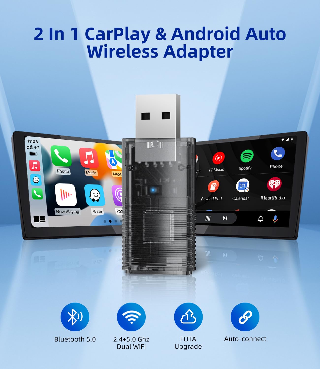 This little item saved me investing $1,000s for car upgrade to get wireless Car Play! Works well, I have not found any feature not available through the wireless adapter as compared to being hard wired. Make a big difference since you never have to take the phone out to connect – I was always forgetting my phone in the car when I had it wired for navigation! Bought one for my wife (iPhone 13), myself (Android), my daughter (iPhone 16), and nephew (iphone 15) and everything works well. Installation took less that 30 seconds since all you do is pair the blutooth to the adapter and Voila everything works! When I get in the car I find I have to hit the MEDIA button on the dash to get it connected quickly, but that is hardly an issue. Have not tried yet but think I can switch between Android and iPhone on the same adapter. Just want to make sure it is set mainly for the primary driver.