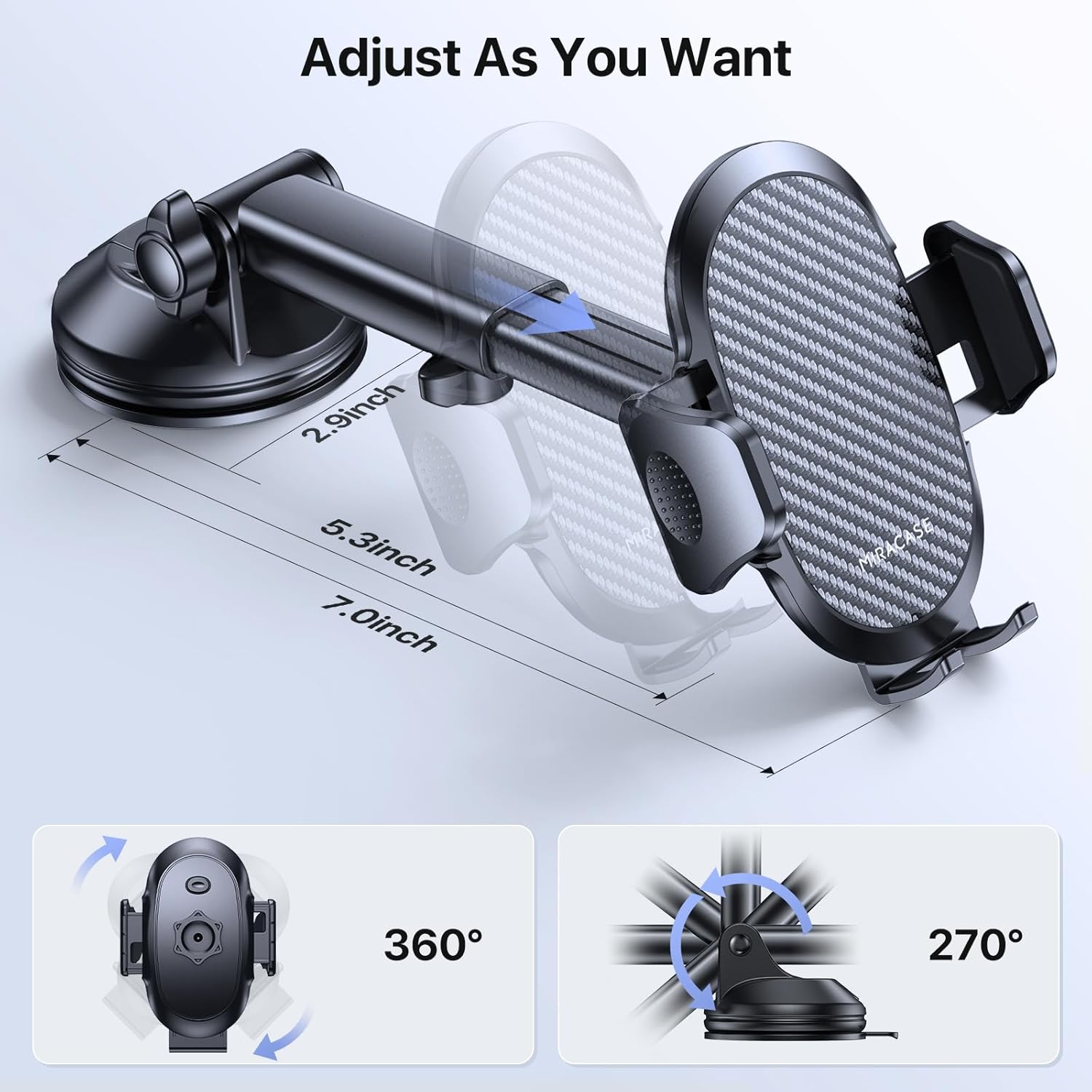 - Super Estável e Seguro: O suporte para celular Miracase conta com um copo de sucção extra forte e um gel adesivo super pegajoso, permitindo que ele se fixe facilmente no painel, para-brisa e outras superfícies planas. O clipe de metal robusto garante que o suporte permaneça firme na ventilação do carro, sem risco de queda.