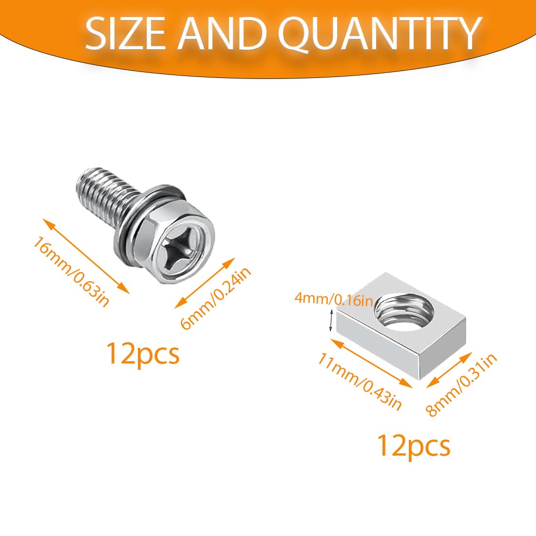 – Quantidade: 24 parafusos (M6x16 mm) e 24 porcas quadradas