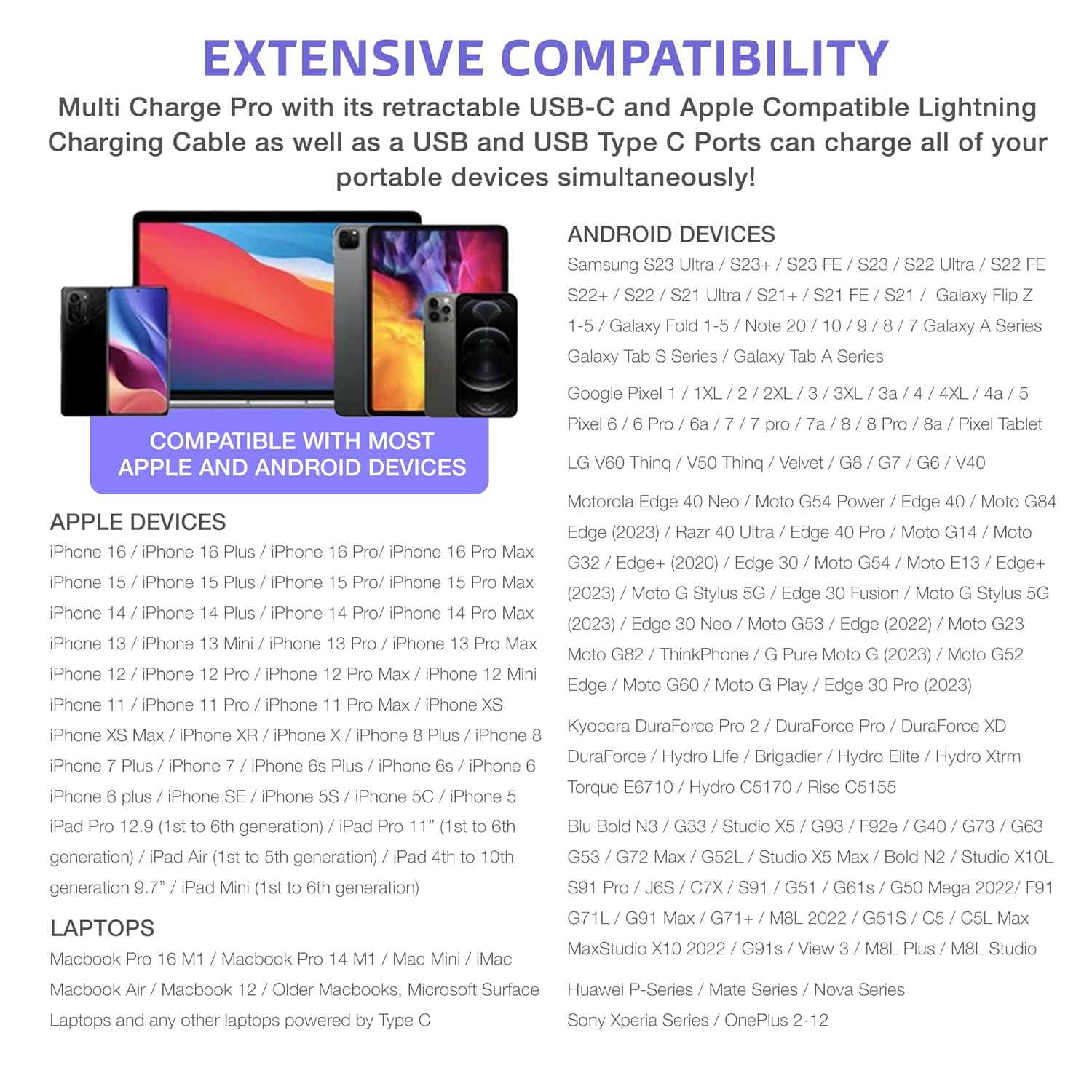 Além disso, o design do Multi Charge Pro foi pensado para oferecer compatibilidade universal. Ele é compatível com uma ampla gama de dispositivos, incluindo smartphones com tecnologia Lightning e Android Galaxy, tablets e laptops. Não é mais necessário carregar vários carregadores; este adaptador faz tudo, com cabos USB-C e Lightning retráteis, além de portas USB tipo A e USB-C.