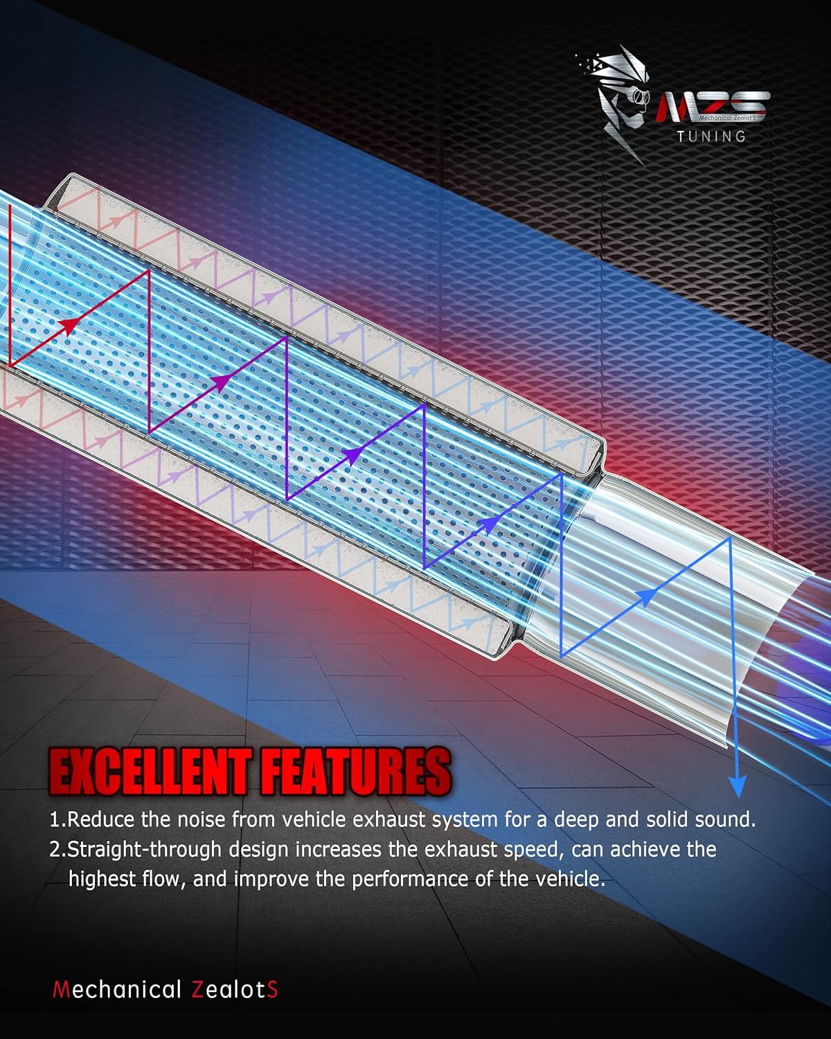 Uma das principais vantagens do MZS é sua construção robusta, que conta com um enchimento denso de algodão acústico de alta qualidade. Este material não apenas absorve a energia vibracional do som, mas também realça a reverberação, proporcionando um tom profundo e agradável. O abafador de passagem reta é projetado para absorver o som enquanto promove um fluxo de escapamento ininterrupto, reduzindo a pressão de retorno e, consequentemente, melhorando o desempenho do veículo.