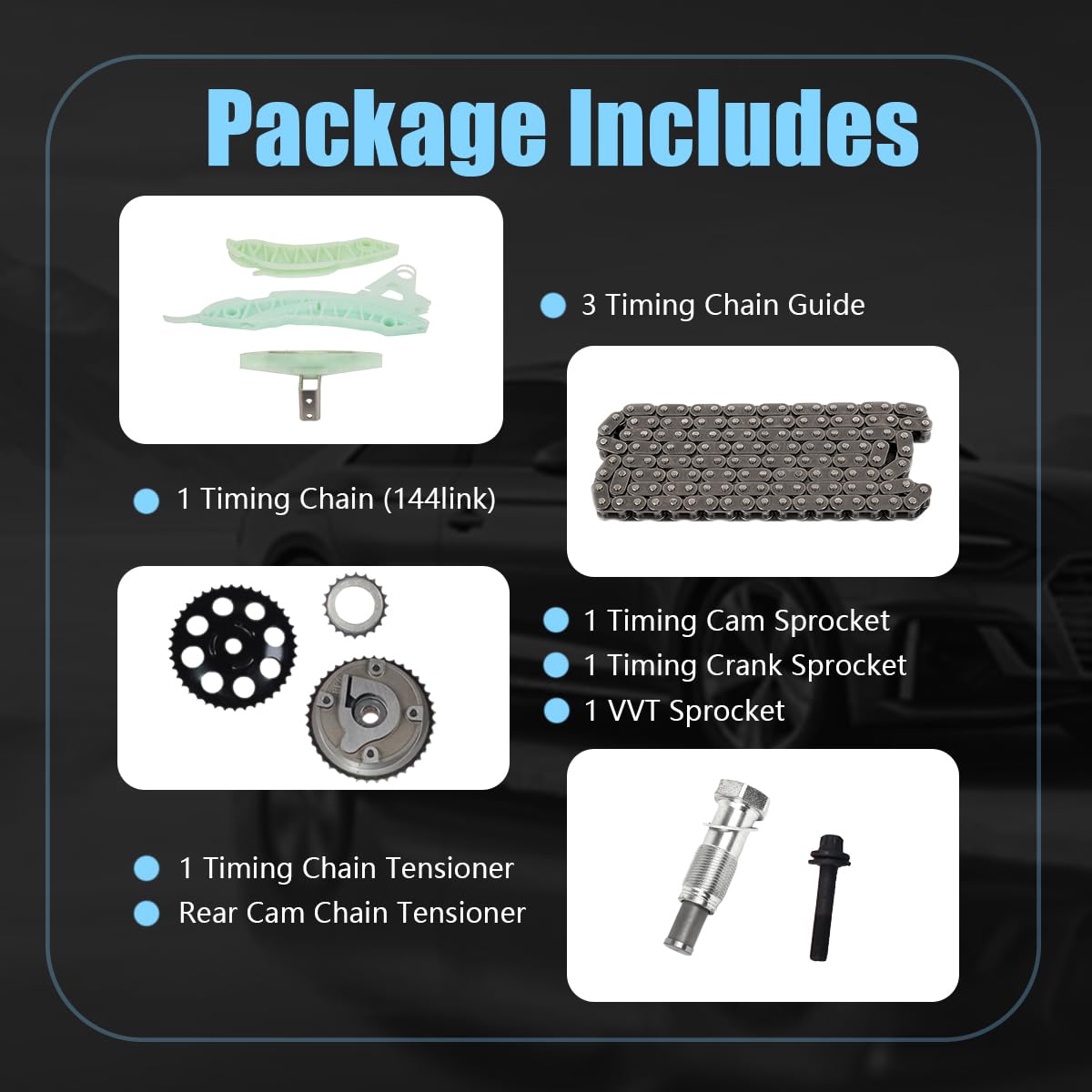 Resposta: A embalagem inclui uma corrente de distribuição, um tensor, engrenagens do comando e virabrequim, guias de corrente e uma engrenagem VVT com parafuso.