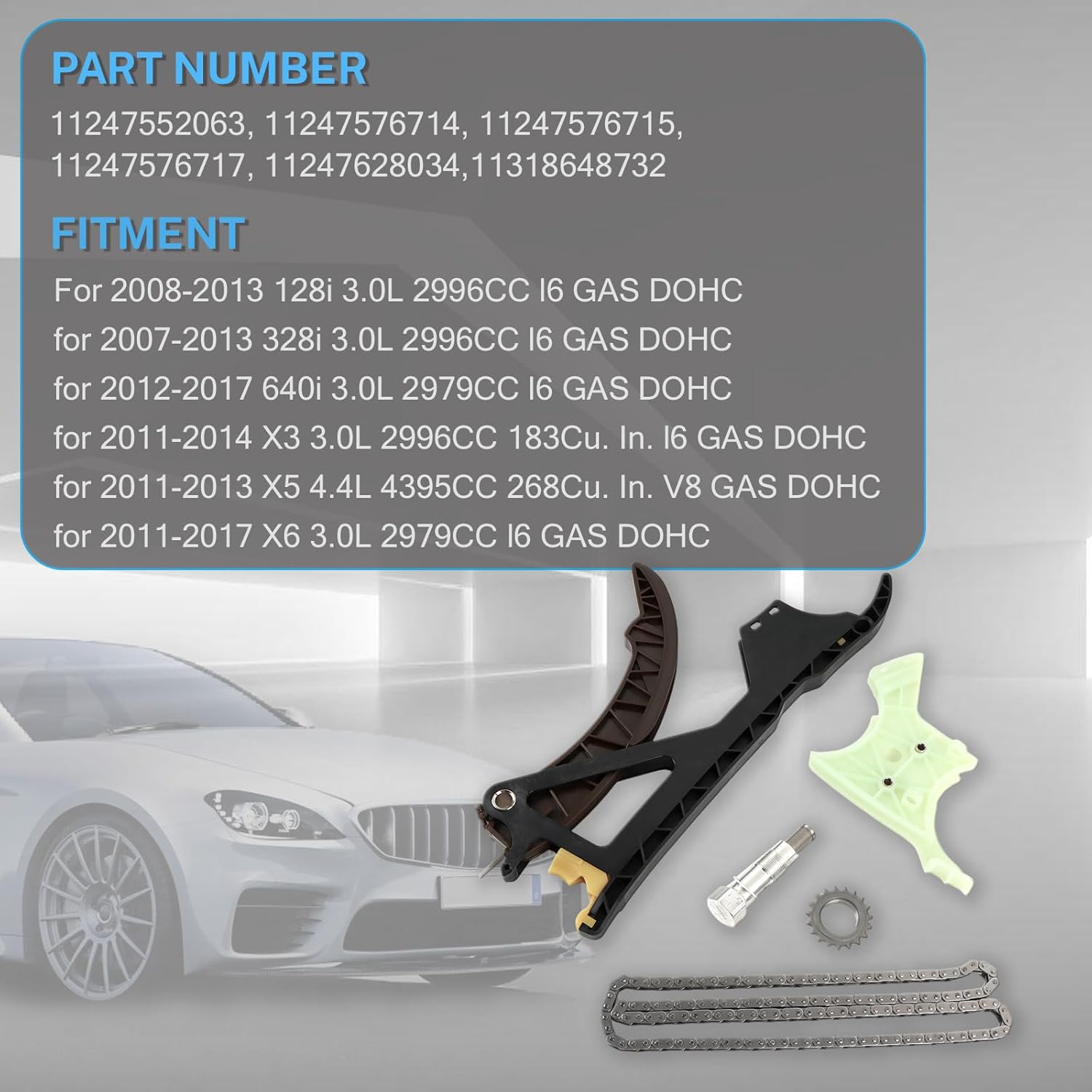 O Kit de Corrente de Distribuição N51 N52 é a escolha perfeita para proprietários de veículos BMW que buscam eficiência e confiabilidade na manutenção do motor. Este kit é projetado para se encaixar em uma ampla gama de modelos, incluindo 535i, X6, M4, X3, X4, X5, F10, F22, F23 e 328, abrangendo os anos de fabricação de 2008 a 2014. Ao substituir as peças originais (OE) 11247552063, 11247576714, 11247576715, 11247576717, 11247628034 e 11318648732, você assegura que seu motor opere de forma suave e sem falhas.