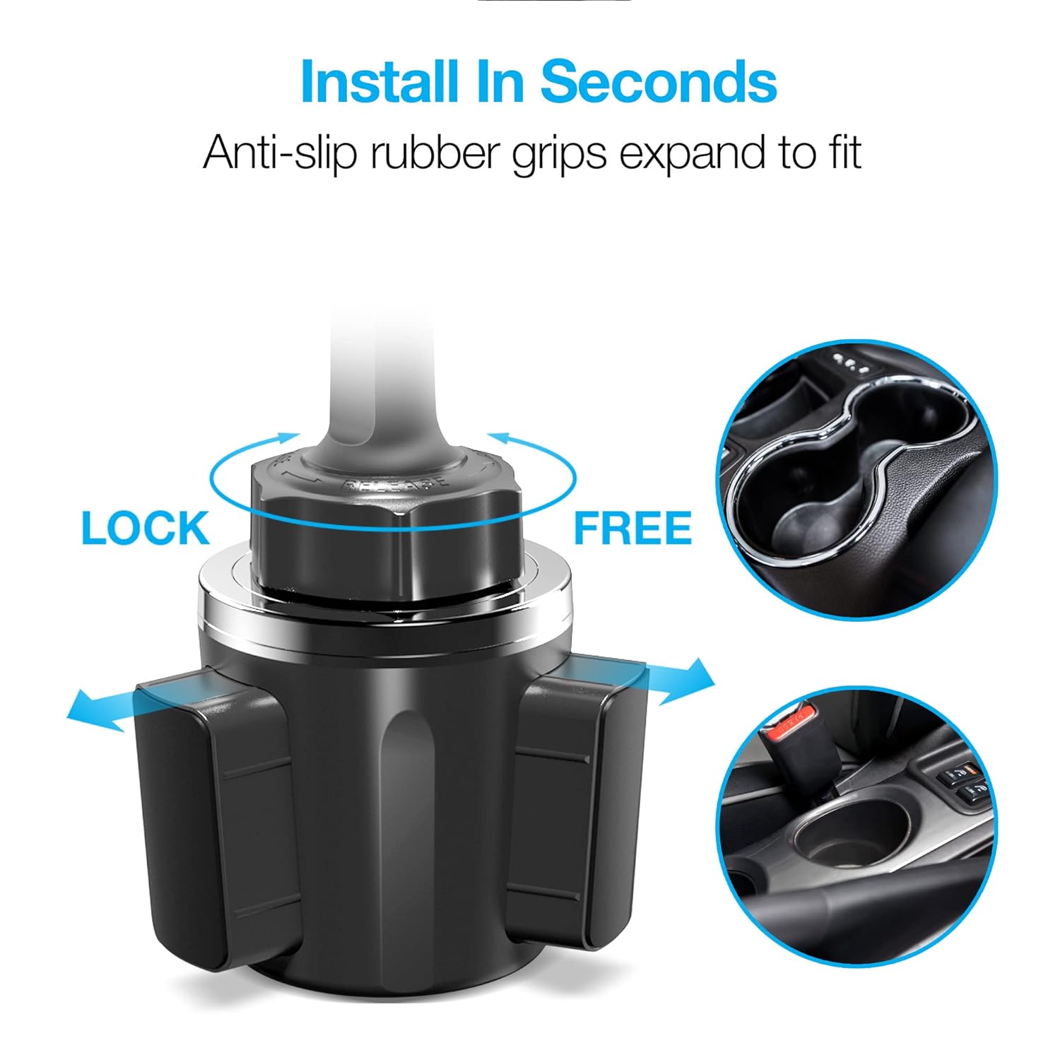 A instalação é simples: basta girar o botão para expandir as garras de borracha, garantindo um encaixe seguro em qualquer porta-copos de carro. Este suporte flexível permite uma instalação sem complicações, ideal para uso rápido e conveniente em veículos.
